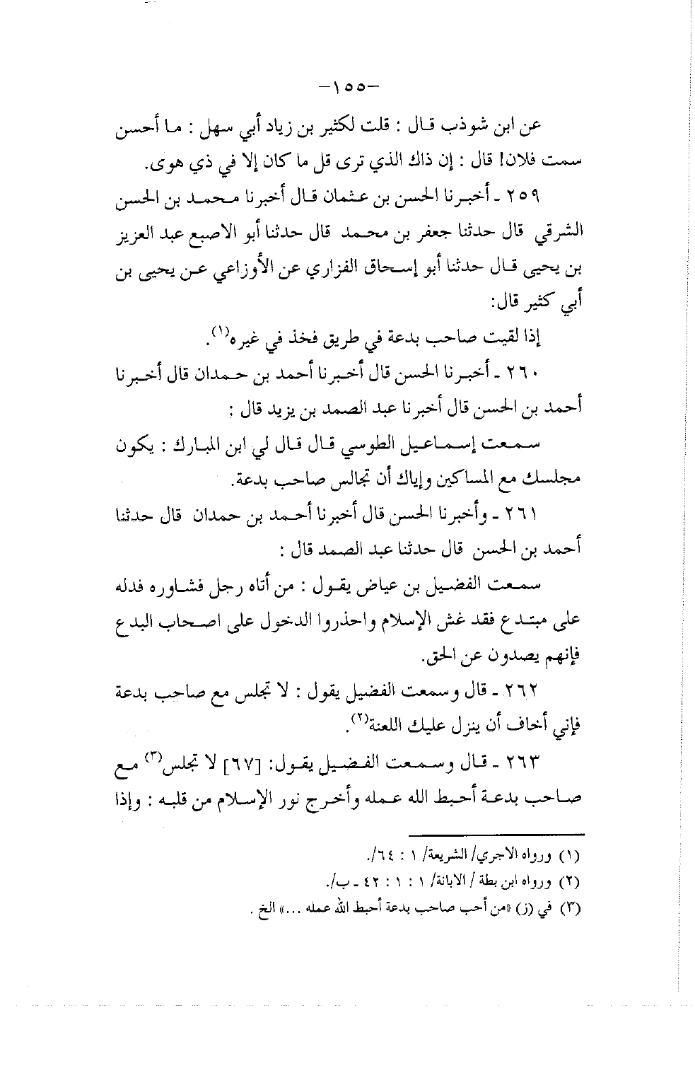 262 - قَالَ: وَسَمِعْتُ الْفُضَيْلَ يَقُولُ: §«لَا تَجْلِسْ مَعَ صَاحِبِ بِدْعَةٍ؛ فَإِنِّي أَخَافُ أَنْ يُنَزِّلَ عَلَيْكَ اللَّعْنَةَ»