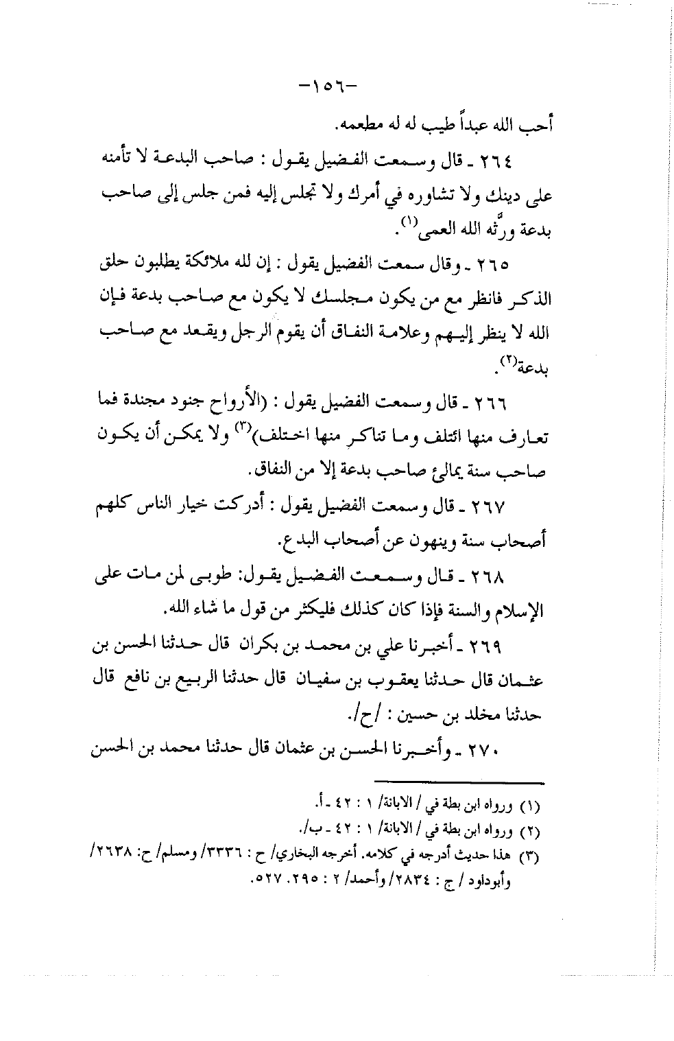 268 - قَالَ: وَسَمِعْتُ الْفُضَيْلَ يَقُولُ: §«طُوبَى لِمَنْ مَاتَ عَلَى الْإِسْلَامِ وَالسُّنَّةِ , فَإِذَا كَانَ كَذَلِكَ فَلْيُكْثِرْ مِنْ قَوْلِ مَا شَاءَ اللَّهُ»