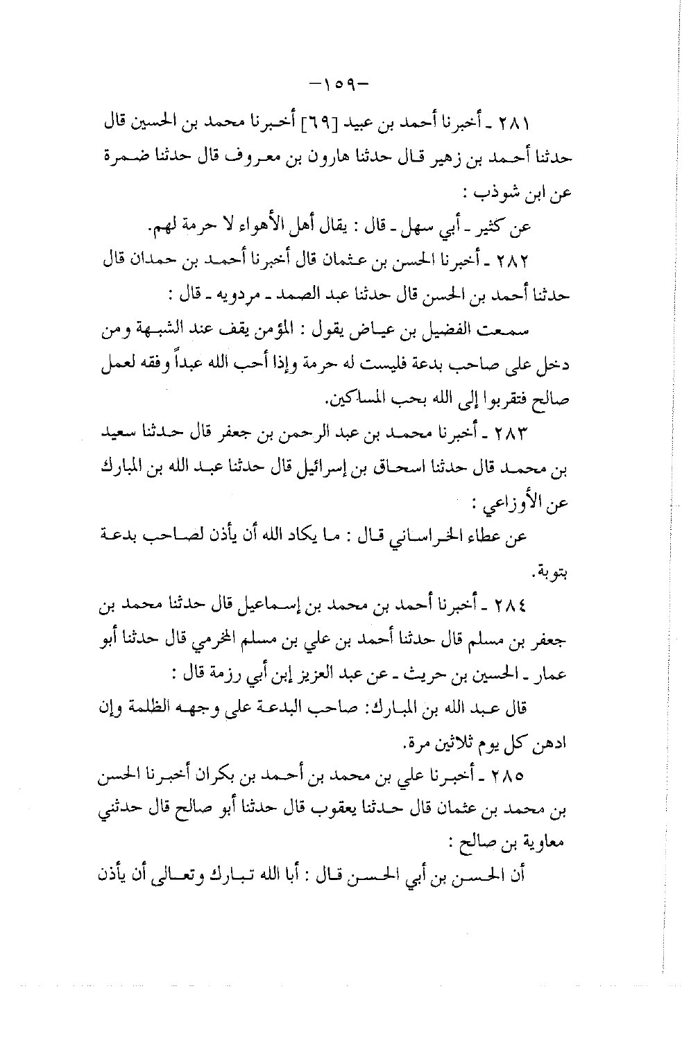 284 - أَخْبَرَنَا أَحْمَدُ بْنُ مُحَمَّدِ بْنِ إِسْمَاعِيلَ , قَالَ: حَدَّثَنَا مُحَمَّدُ بْنُ جَعْفَرِ بْنِ مُسْلِمٍ , قَالَ: حَدَّثَنَا أَحْمَدُ بْنُ عَلِيِّ بْنِ مُسْلِمٍ الْمُخَرِّمِيُّ , قَالَ: حَدَّثَنَا أَبُو عَمَّارٍ الْحُسَيْنُ بْنُ حُرَيْثٍ , عَنْ عَبْدِ الْعَزِيزِ بْنِ أَبِي رِزْمَةَ , قَالَ: قَالَ عَبْدُ اللَّهِ بْنُ الْمُبَارَكِ: §«صَاحِبُ الْبِدْعَةِ عَلَى وَجْهِهِ الظُّلْمَةُ , وَإِنِ ادَّهَنَ كُلَّ يَوْمٍ ثَلَاثِينَ مَرَّةً»