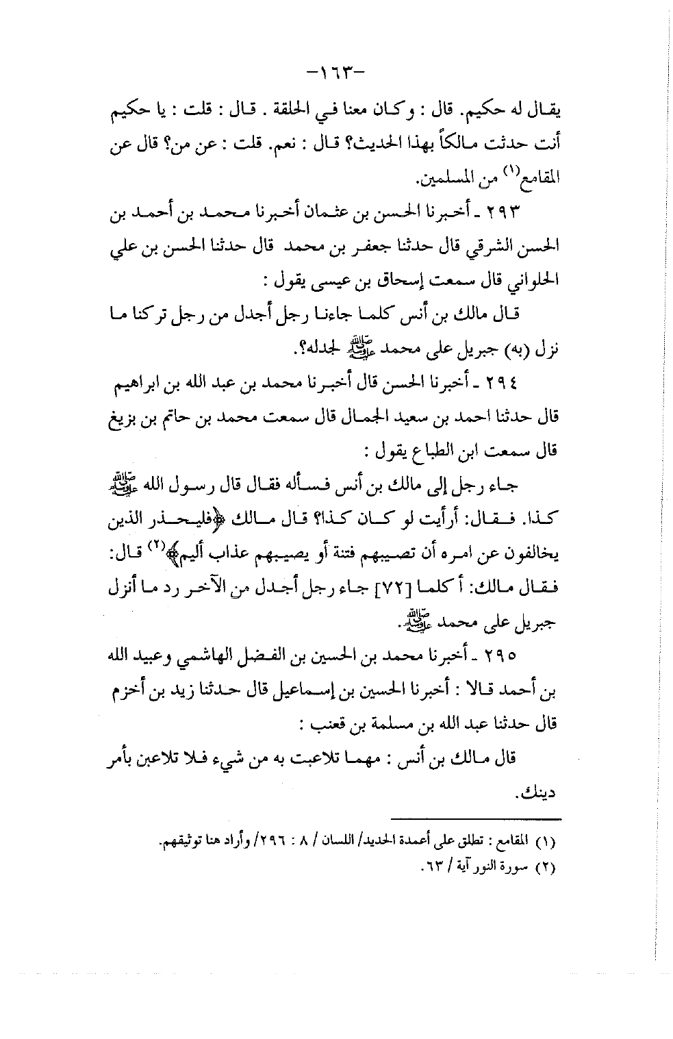 293 - أَخْبَرَنَا الْحَسَنُ بْنُ عُثْمَانَ , أَخْبَرَنَا مُحَمَّدُ بْنُ أَحْمَدَ بْنِ الْحَسَنِ الشَّرْقِيُّ , قَالَ: حَدَّثَنَا جَعْفَرُ بْنُ مُحَمَّدٍ , قَالَ: حَدَّثَنَا الْحَسَنُ بْنُ عَلِيٍّ الْحُلْوَانِيُّ , قَالَ: سَمِعْتُ إِسْحَاقَ بْنَ عِيسَى يَقُولُ: " قَالَ مَالِكُ بْنُ أَنَسٍ: §«كُلَّمَا جَاءَنَا رَجُلٌ أَجْدَلُ مِنْ رَجُلٍ تَرَكْنَا مَا نَزَلَ بِهِ جِبْرِيلُ عَلَى مُحَمَّدٍ صَلَّى اللهُ عَلَيْهِ وَسَلَّمَ لِجَدَلِهِ»