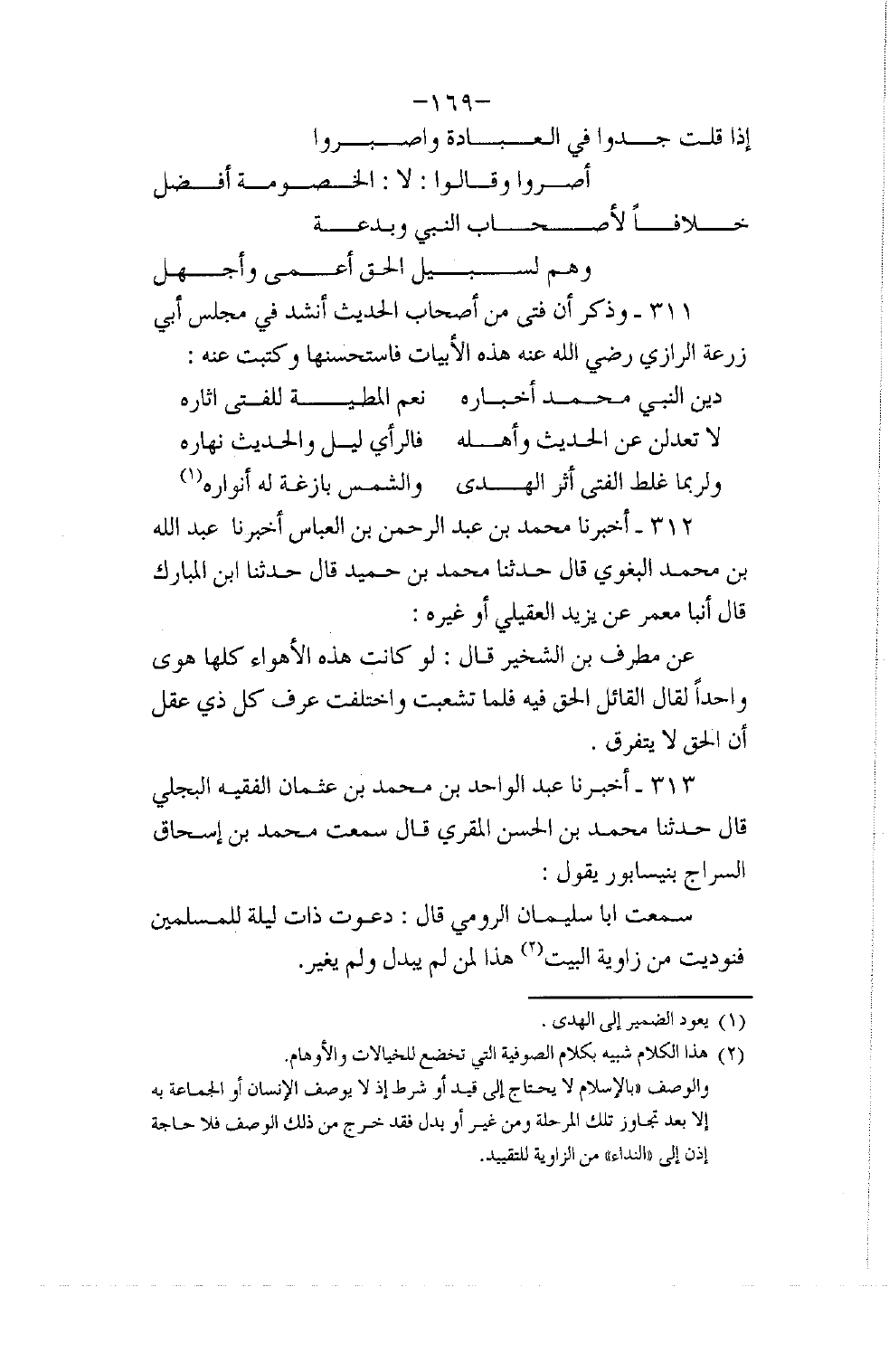 313 - أَخْبَرَنَا عَبْدُ الْوَاحِدِ بْنُ مُحَمَّدِ بْنِ عُثْمَانَ الْفَقِيهُ الْبَجَلِيُّ , قَالَ: حَدَّثَنَا مُحَمَّدُ بْنُ الْحَسَنِ الْمُقْرِئُ , قَالَ: سَمِعْتُ مُحَمَّدَ بْنَ إِسْحَاقَ السَّرَّاجَ بنَيْسَابُورَ يَقُولُ: سَمِعْتُ الْمَدُومِيَّ قَالَ: §«دَعَوْتُ ذَاتَ لَيْلَةٍ لِلْمُسْلِمِينَ , فَنُودِيتُ مِنْ زَاوِيَةِ الْبَيْتِ» : «هَذَا لِمَنْ لَمْ يُبَدِّلْ وَلَمْ يُغَيِّرْ»