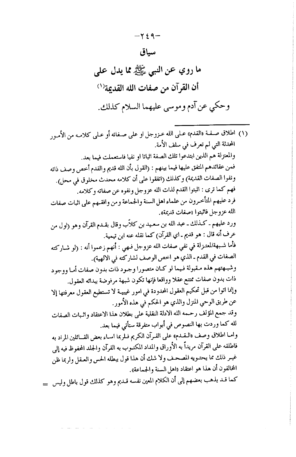 §سِيَاقُ مَا رُوِيَ عَنِ النَّبِيِّ صَلَّى اللهُ عَلَيْهِ وَسَلَّمَ مِمَّا يَدُلُّ عَلَى أَنَّ الْقُرْآنَ مِنْ صِفَاتِ اللَّهِ الْقَدِيمَةِ وَحُكِيَ عَنْ آدَمَ وَمُوسَى عَلَيْهِمَا السَّلَامُ كَذَلِكَ.
