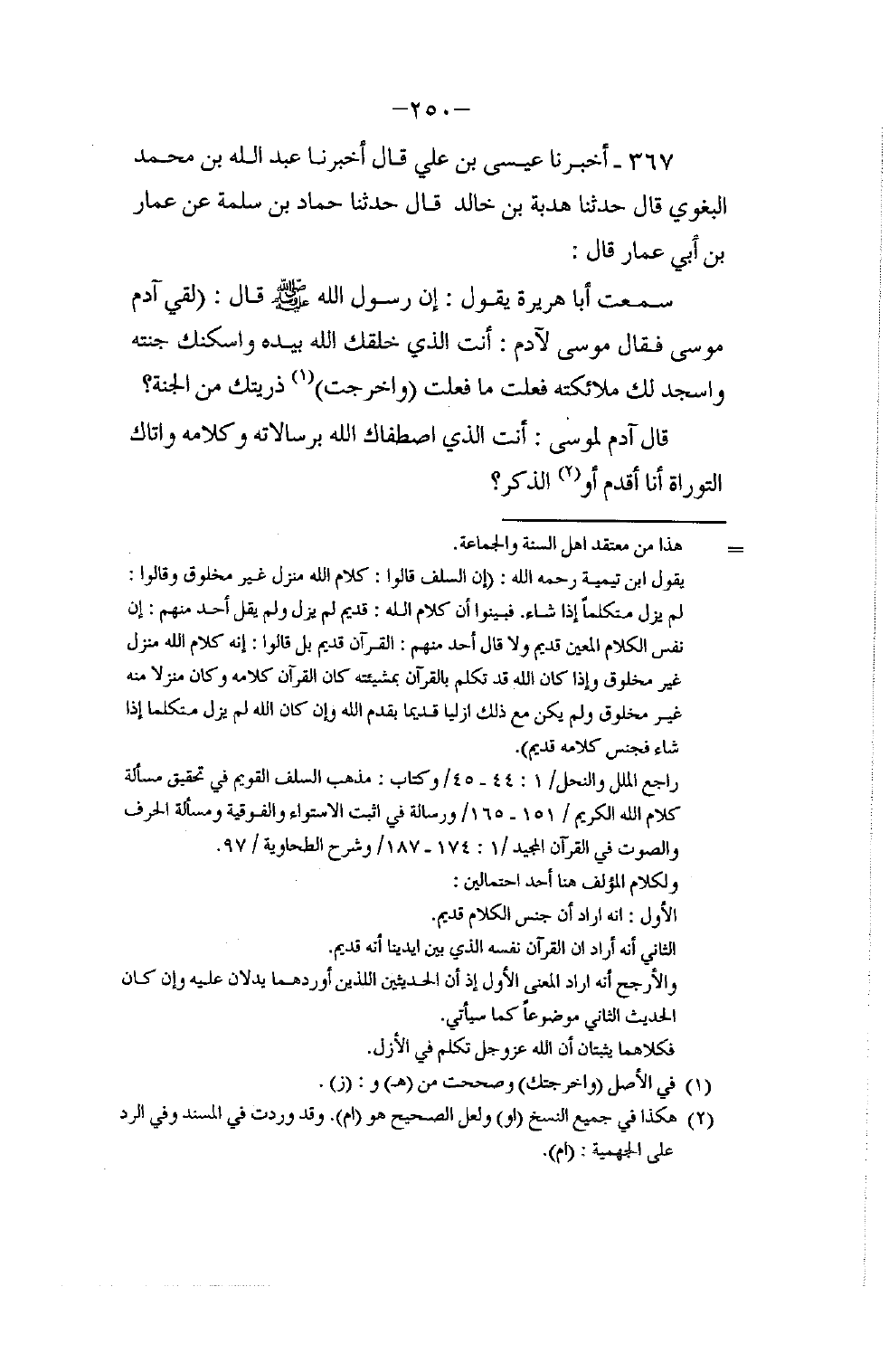 367 - أَخْبَرَنَا عِيسَى بْنُ عَلِيٍّ قَالَ: أَخْبَرَنَا عَبْدُ اللَّهِ بْنُ مُحَمَّدٍ الْبَغَوِيُّ قَالَ: حَدَّثَنَا هُدْبَةُ بْنُ خَالِدٍ قَالَ: حَدَّثَنَا حَمَّادُ بْنُ سَلَمَةَ , عَنْ عَمَّارِ بْنِ أَبِي عَمَّارٍ قَالَ: سَمِعْتُ أَبَا هُرَيْرَةَ يَقُولُ: إِنَّ رَسُولَ اللَّهِ صَلَّى اللهُ عَلَيْهِ وَسَلَّمَ قَالَ: لَقِيَ آدَمُ مُوسَى فَقَالَ مُوسَى لِآدَمَ: أَنْتَ الَّذِي خَلَقَكَ اللَّهُ بِيَدِهِ , وَأَسْكَنَكَ جَنَّتَهُ , وَأَسْجَدَ لَكَ مَلَائِكَتَهُ , فَعَلْتَ مَا فَعَلْتَ وَأَخْرَجْتَ ذُرِّيَّتَكَ مِنَ الْجَنَّةِ؟ قَالَ آدَمُ لِمُوسَى: أَنْتَ الَّذِي اصْطَفَاكَ اللَّهُ بِرِسَالَاتِهِ وَكَلَامِهِ وَآتَاكَ التَّوْرَاةَ , أَنَا أقْدَمُ أَوِ الذِّكْرُ؟ -[251]- قَالَ: بَلِ الذِّكْرُ. قَالَ رَسُولُ اللَّهِ صَلَّى اللهُ عَلَيْهِ وَسَلَّمَ §فَحَجَّ آدَمُ مُوسَى