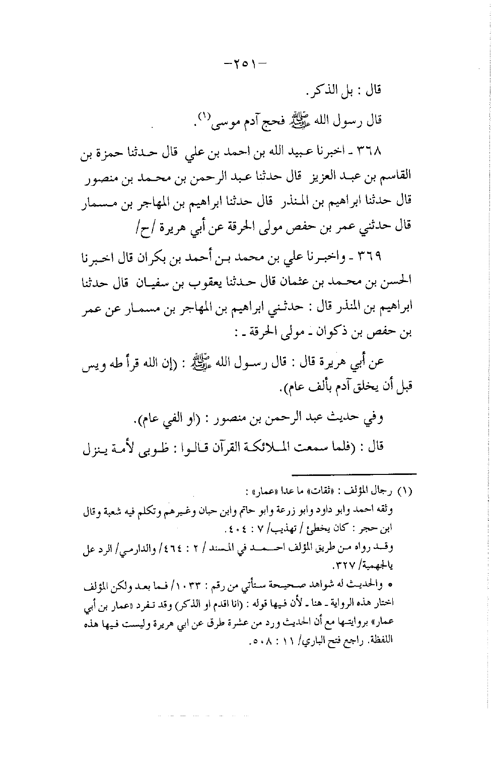 369 - وَأَخْبَرَنَا عَلِيُّ بْنُ مُحَمَّدِ بْنِ أَحْمَدَ بْنِ بَكْرَانَ قَالَ: أَخْبَرَنَا الْحَسَنُ بْنُ مُحَمَّدِ بْنِ عُثْمَانَ قَالَ: حَدَّثَنَا يَعْقُوبُ بْنُ سُفْيَانَ قَالَ: حَدَّثَنَا إِبْرَاهِيمُ بْنُ الْمُنْذِرِ قَالَ: حَدَّثَنِي إِبْرَاهِيمُ بْنُ الْمُهَاجِرِ بْنِ مِسْمَارٍ , عَنْ عُمَرَ بْنِ حَفْصِ بْنِ ذَكْوَانَ مَوْلَى الْحُرَقَةِ، عَنْ أَبِي هُرَيْرَةَ قَالَ: قَالَ رَسُولُ اللَّهِ صَلَّى اللهُ عَلَيْهِ وَسَلَّمَ: «§إِنَّ اللَّهَ قَرَأَ طه وَيس قَبْلَ أَنْ يَخْلُقَ آدَمَ بِأَلْفِ عَامٍ» . وَفِي حَدِيثِ عَبْدِ الرَّحْمَنِ بْنِ مَنْصُورٍ «أَوْ أَلْفَيْ عَامٍ» . قَالَ: " فَلَمَّا سَمِعَتِ الْمَلَائِكَةُ الْقُرْآنَ قَالُوا: طُوبَى لِأُمَّةٍ يَنْزِلُ -[252]- عَلَيْهَا هَذَا ". وَفِي حَدِيثِ عَبْدِ الرَّحْمَنِ: «لِأُمَّةٍ يَنْزِلُ هَذَا عَلَيْهَا , وَطُوبَى لِأَجْوَافٍ تَحْمِلُ هَذَا , وَطُوبَى لِلِسَانٍ أَوْ لِإِنْسَانٍ تَكَلَّمَ بِهَذَا» . وَلَفْظُ عَبْدِ الرَّحْمَنِ: وَطُوبَى لِأَلْسُنٍ تَكَلَّمُ بِهَذَا , وَطُوبَى لِأَجْوَافٍ تَحْمِلُ هَذَا