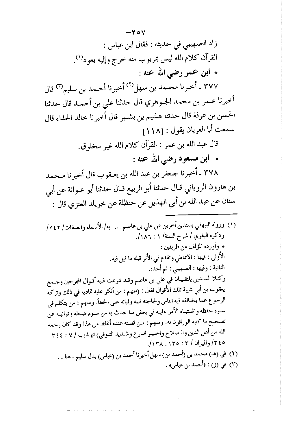 377 - أَخْبَرَنَا مُحَمَّدُ بْنُ سَهْلٍ , أَخْبَرَنَا أَحْمَدُ بْنُ سُلَيْمٍ قَالَ: أَخْبَرَنَا عُمَرُ بْنُ مُحَمَّدٍ الْجَوْهَرِيُّ قَالَ: حَدَّثَنَا عَلِيُّ بْنُ أَحْمَدَ قَالَ: حَدَّثَنَا الْحَسَنُ بْنُ عَرَفَةَ , فَقَالَ: حَدَّثَنَا هُشَيْمُ بْنُ بَشِيرٍ قَالَ: أَخْبَرَنَا خَالِدٌ الْحَذَّاءُ قَالَ: سَمِعْتُ أَبَا الْعُرْيَانِ يَقُولُ: قَالَ عَبْدُ اللَّهِ بْنُ عُمَرَ: §الْقُرْآنُ كَلَامُ اللَّهِ غَيْرُ مَخْلُوقٍ
