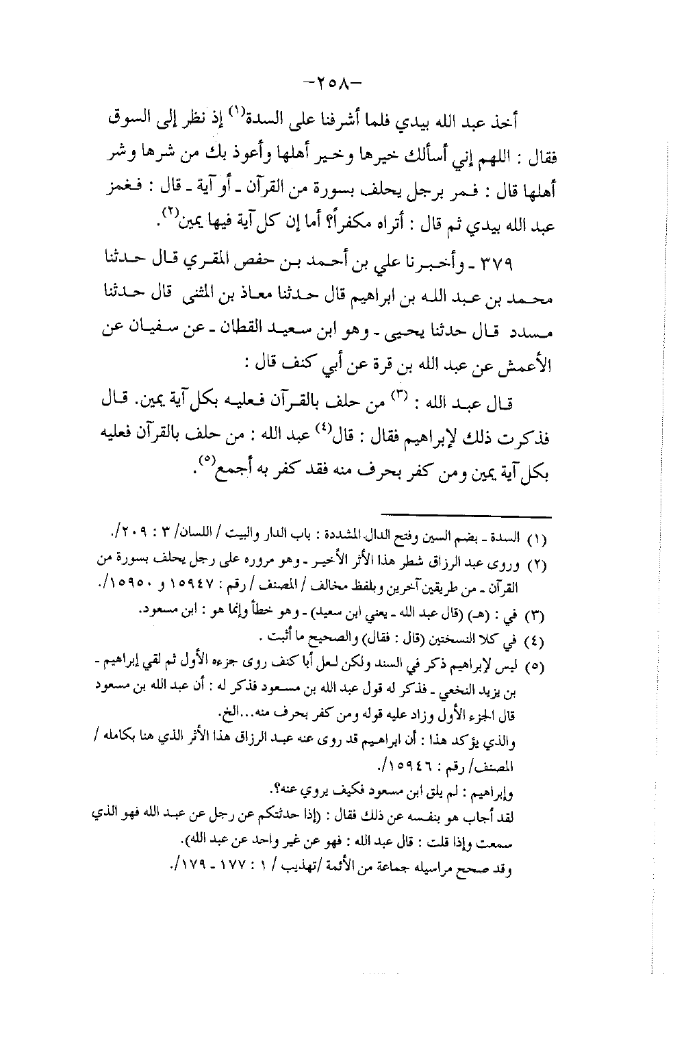 379 - وَأَخْبَرَنَا عَلِيُّ بْنُ أَحْمَدَ بْنِ حَفْصٍ الْمُقْرِئُ قَالَ: حَدَّثَنَا مُحَمَّدُ بْنُ عَبْدِ اللَّهِ بْنِ إِبْرَاهِيمَ قَالَ: حَدَّثَنَا مُعَاذُ بْنُ الْمُثَنَّى قَالَ: حَدَّثَنَا مُسَدَّدٌ قَالَ: حَدَّثَنَا يَحْيَى وَهُوَ ابْنُ سَعِيدٍ الْقَطَّانُ , عَنْ سُفْيَانَ , عَنِ الْأَعْمَشِ , عَنْ عَبْدِ اللَّهِ بْنِ مُرَّةَ , عَنْ أَبِي كَنَفٍ قَالَ: قَالَ عَبْدُ اللَّهِ: §مَنْ حَلَفَ بِالْقُرْآنِ فَعَلَيْهِ بِكُلِّ آيَةٍ يَمِينٌ. قَالَ: فَذَكَرْتُ ذَلِكَ لِإِبْرَاهِيمَ فَقَالَ: قَالَ عَبْدُ اللَّهِ: مَنْ حَلَفَ بِالْقُرْآنِ فَعَلَيْهِ بِكُلِّ آيَةٍ يَمِينٌ , وَمَنْ كَفَرَ بِحَرْفٍ مِنْهُ فَقَدْ كَفَرَ بِهِ أَجْمَعَ -[259]-. قُلْتُ: وَالْكَفَّارَةُ لَا تَجِبُ إِذَا حَلَفَ بِمَخْلُوقٍ
