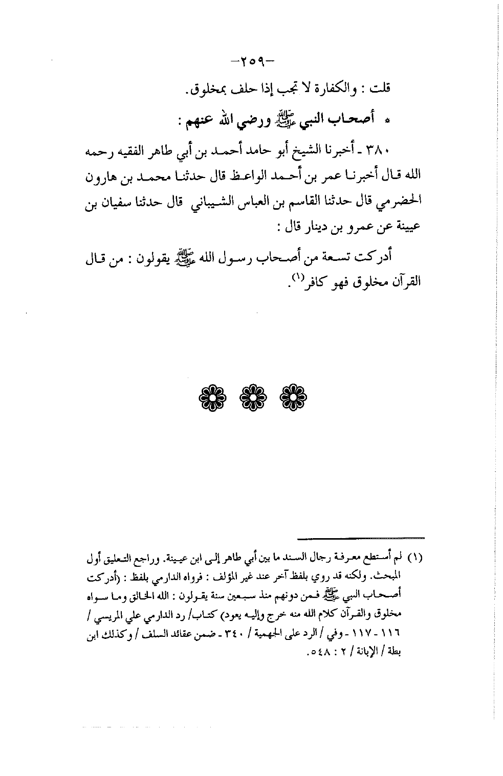 380 - أَخْبَرَنَا الشَّيْخُ أَبُو حَامِدٍ أَحْمَدُ بْنُ أَبِي طَاهِرٍ الْفَقِيهُ رَحِمَهُ اللَّهُ قَالَ: أَخْبَرَنَا عُمَرُ بْنُ أَحْمَدَ الْوَاعِظُ قَالَ: حَدَّثَنَا مُحَمَّدُ بْنُ هَارُونَ الْحَضْرَمِيُّ قَالَ: حَدَّثَنَا الْقَاسِمُ بْنُ الْعَبَّاسِ الشَّيْبَانِيُّ قَالَ: حَدَّثَنَا سُفْيَانُ بْنُ عُيَيْنَةَ , عَنْ عَمْرِو بْنِ دِينَارٍ قَالَ: أَدْرَكْتُ تِسْعَةً مِنْ أَصْحَابِ رَسُولِ اللَّهِ صَلَّى اللهُ عَلَيْهِ وَسَلَّمَ يَقُولُونَ: §مَنْ قَالَ الْقُرْآنُ مَخْلُوقٌ؛ فَهُوَ كَافِرٌ