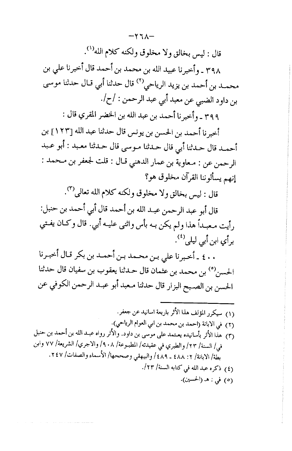 399 - وَأَخْبَرَنَا أَحْمَدُ بْنُ عَبْدِ اللَّهِ بْنِ الْخَضِرِ الْمُقْرِئُ قَالَ: أَخْبَرَنَا أَحْمَدُ بْنُ الْحَسَنِ بْنِ يُونُسَ قَالَ: حَدَّثَنَا عَبْدُ اللَّهِ بْنُ أَحْمَدَ قَالَ: حَدَّثَنَا أَبِي قَالَ: حَدَّثَنَا مُوسَى قَالَ: حَدَّثَنَا مَعْبَدٌ أَبُو عَبْدِ الرَّحْمَنِ , عَنْ مُعَاوِيَةَ بْنِ عَمَّارٍ الدُّهْنِيِّ قَالَ: قُلْتُ لِجَعْفَرِ بْنِ مُحَمَّدٍ: إِنَّهُمْ يَسْأَلُونَنَا عَنِ الْقُرْآنِ , مَخْلُوقٌ هُوَ؟ قَالَ: §«لَيْسَ بِخَالِقٍ وَلَا مَخْلُوقٍ , وَلَكِنَّهُ كَلَامُ اللَّهِ تَعَالَى» قَالَ أَبُو عَبْدِ الرَّحْمَنِ عَبْدُ اللَّهِ بْنُ أَحْمَدَ: قَالَ أَبِي أَحْمَدُ بْنُ حَنْبَلٍ: رَأَيْتُ مَعْبَدًا هَذَا وَلَمْ يَكُنْ بِهِ بَأْسٌ وَأَثْنَى عَلَيْهِ أَبِي , قَالَ: وَكَانَ يُفْتِي بِرَأْيِ ابْنِ أَبِي لَيْلَى