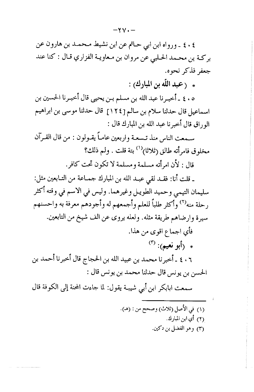 405 - أَخْبَرَنَا عَبْدُ اللَّهِ بْنُ مُسْلِمِ بْنِ يَحْيَى قَالَ: أَخْبَرَنَا الْحُسَيْنُ بْنُ إِسْمَاعِيلَ قَالَ: حَدَّثَنَا سَلَّامُ بْنُ سَالِمٍ قَالَ: حَدَّثَنَا مُوسَى بْنُ إِبْرَاهِيمَ الْوَرَّاقُ قَالَ: أَخْبَرَنَا عَبْدُ اللَّهِ بْنُ الْمُبَارَكِ قَالَ: سَمِعْتُ النَّاسَ مُنْذُ تِسْعَةٍ وَأَرْبَعِينَ عَامًا يَقُولُونَ: §مَنْ قَالَ: الْقُرْآنُ مَخْلُوقٌ , فَامْرَأَتُهُ طَالِقٌ ثَلَاثًا الْبَتَّةَ. قُلْتُ: وَلِمَ ذَلِكَ؟ قَالَ: لِأَنَّ امْرَأَتَهُ مُسْلِمَةٌ , وَمُسْلِمَةٌ لَا تَكُونُ تَحْتَ كَافِرٍ قُلْتُ أَنَا: فَقَدْ لَقِيَ عَبْدُ اللَّهِ بْنُ الْمُبَارَكِ جَمَاعَةً مِنَ التَّابِعِينَ مِثْلَ سُلَيْمَانَ التَّيْمِيِّ , وَحُمَيْدٍ الطَّوِيلِ , وَغَيْرِهِمَا , وَلَيْسَ فِي الْإِسْلَامِ فِي وَقْتِهِ أَكْثَرُ رِحْلَةً مِنْهُ , وَأَكْثَرُ طَلَبًا لِلْعِلْمِ , وَأَجْمَعُهُمْ لَهُ , وَأَجْوَدُهُمْ مَعْرِفَةً بِهِ , وَأَحْسَنُهُمْ سِيرَةً , وَأَرْضَاهُمْ طَرِيقَةً مِثْلُهُ , وَلَعَلَّهُ يَرْوِي عَنْ أَلْفِ شَيْخٍ مِنَ التَّابِعِينَ. فَأَيُّ إِجْمَاعٍ أَقْوَى مِنْ هَذَا؟
