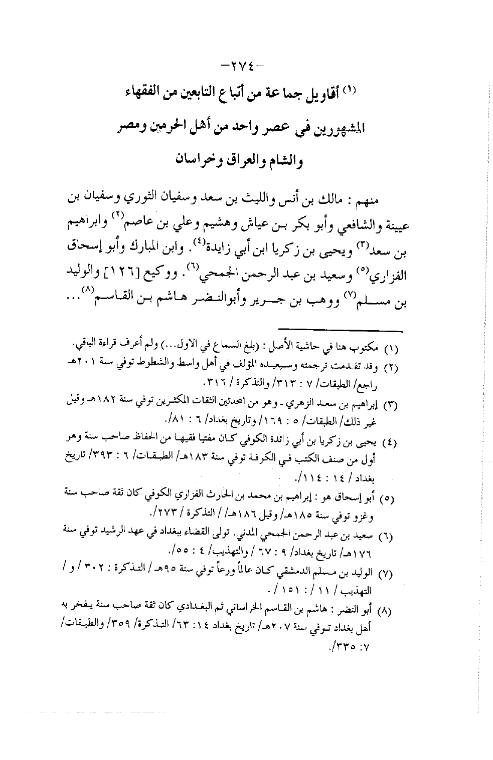 §أَقَاوِيلُ جَمَاعَةٍ مِنْ أَتْبَاعِ التَّابِعِينَ مِنَ الْفُقَهَاءِ الْمَشْهُورِينَ فِي عَصْرٍ وَاحِدٍ مِنْ أَهْلِ الْحَرَمَيْنِ وَمِصْرَ وَالشَّامِ وَالْعِرَاقِ وَخُرَاسَانَ مِنْهُمْ: مَالِكُ بْنُ أَنَسٍ , وَاللَّيْثُ بْنُ سَعْدٍ , وَسُفْيَانُ الثَّوْرِيُّ , وَسُفْيَانُ بْنُ عُيَيْنَةَ , وَالشَّافِعِيُّ , وَأَبُو بَكْرِ بْنُ عَيَّاشٍ , وَهُشَيْمٌ , وَعَلِيُّ بْنُ عَاصِمٍ , وَإِبْرَاهِيمُ بْنُ سَعْدٍ , وَيَحْيَى بْنُ زَكَرِيَّا بْنِ أَبِي زَائِدَةَ , وَابْنُ الْمُبَارَكِ , وَأَبُو إِسْحَاقَ الْفَزَارِيُّ , وَسَعِيدُ بْنُ عَبْدِ الرَّحْمَنِ الْجُمَحِيُّ , وَوَكِيعٌ , وَالْوَلِيدُ بْنُ مُسْلِمٍ , وَوَهْبُ بْنُ جَرِيرٍ , وَأَبُو النَّضْرِ هَاشِمُ بْنُ الْقَاسِمِ , -[275]- وَأَبُو أُسَامَةَ , وَعَبْدُ اللَّهِ بْنُ إِدْرِيسَ , وَعَبْدَةُ بْنُ سُلَيْمَانَ