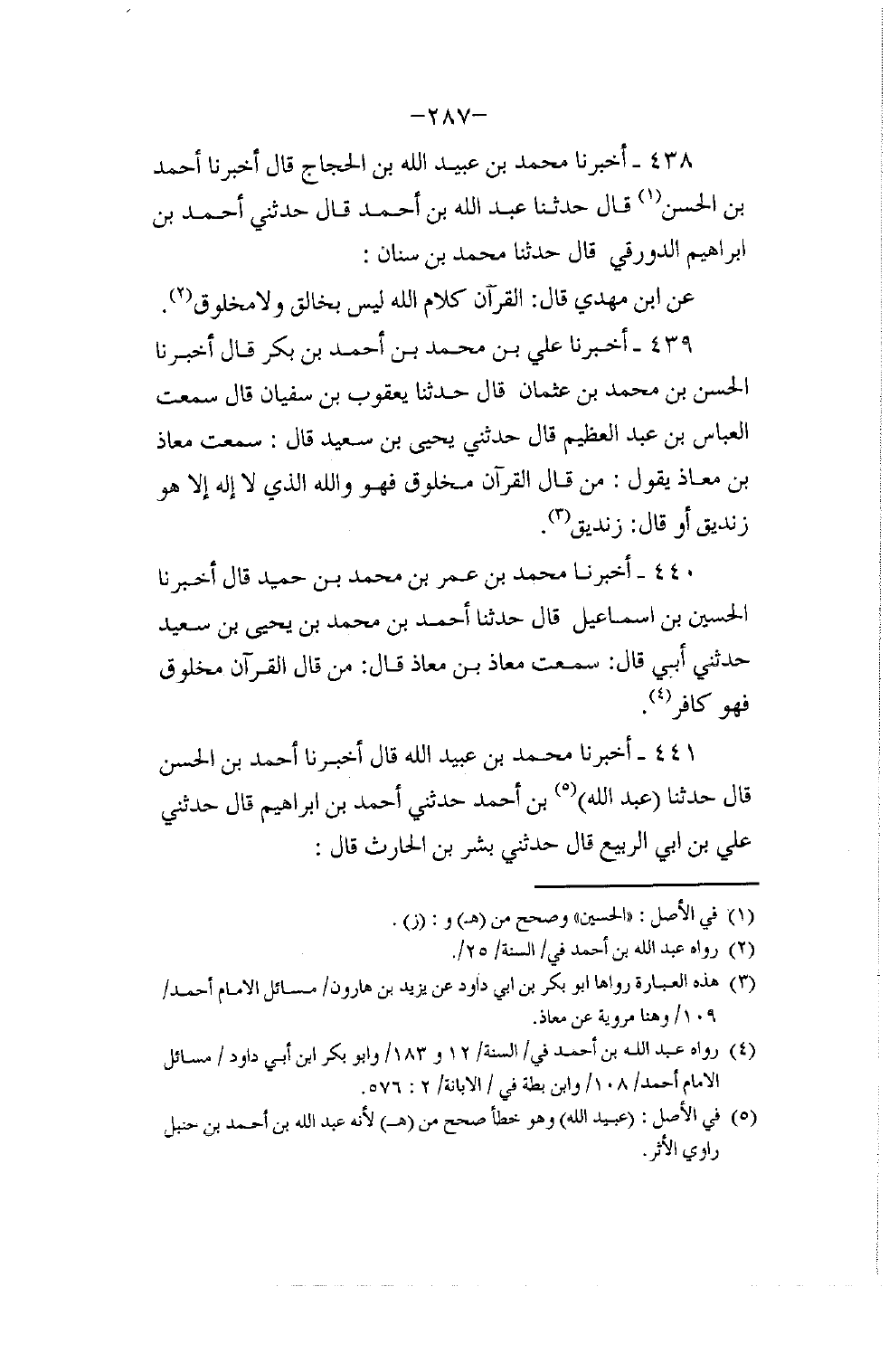 أَخْبَرَنَا مُحَمَّدُ بْنُ عُبَيْدِ اللَّهِ بْنِ الْحَجَّاجِ قَالَ: أَخْبَرَنَا أَحْمَدُ بْنُ الْحَسَنِ قَالَ: حَدَّثَنَا عَبْدُ اللَّهِ بْنُ أَحْمَدَ قَالَ: حَدَّثَنِي أَحْمَدُ بْنُ إِبْرَاهِيمَ الدَّوْرَقِيُّ قَالَ: حَدَّثَنَا مُحَمَّدُ بْنُ سِنَانٍ , عَنِ ابْنِ مَهْدِيٍّ قَالَ: §الْقُرْآنُ كَلَامُ اللَّهِ لَيْسَ بِخَالِقٍ وَلَا مَخْلُوقٍ