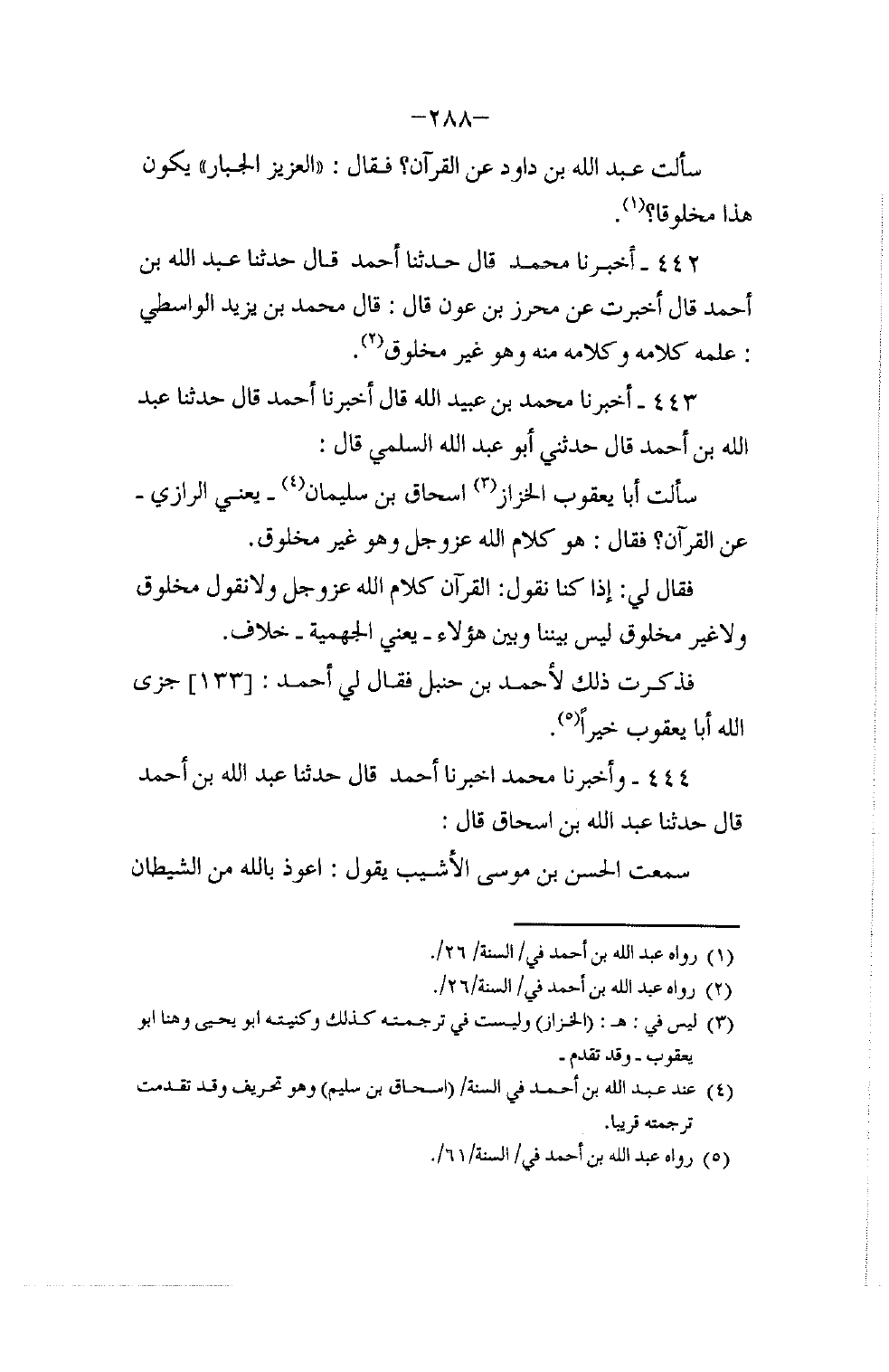 أَخْبَرَنَا مُحَمَّدٌ قَالَ: حَدَّثَنَا أَحْمَدُ قَالَ: حَدَّثَنَا عَبْدُ اللَّهِ بْنُ أَحْمَدَ قَالَ: أُخْبِرْتُ عَنْ مُحْرِزِ بْنِ عَوْنٍ قَالَ: قَالَ مُحَمَّدُ بْنُ يَزِيدَ الْوَاسِطِيُّ: §«عِلْمُهُ كَلَامُهُ , وَكَلَامُهُ مِنْهُ , وَهُوَ غَيْرُ مَخْلُوقٍ»