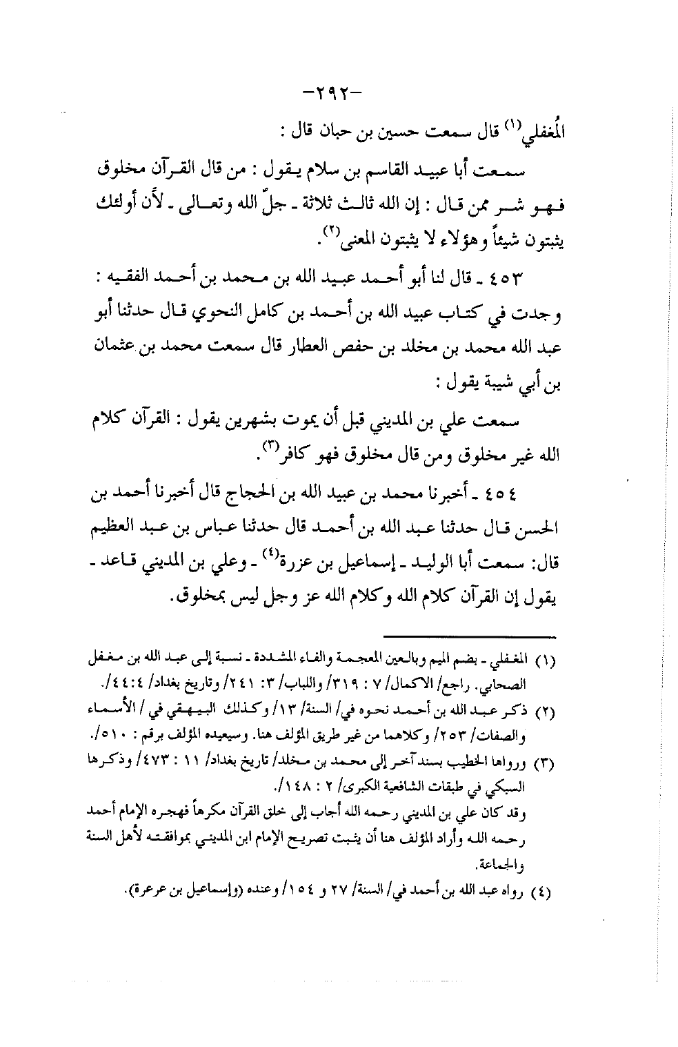 453 - قَالَ لَنَا أَبُو أَحْمَدَ عُبَيْدُ اللَّهِ بْنُ مُحَمَّدِ بْنِ أَحْمَدَ الْفَقِيهُ: وَجَدْتُ فِي كِتَابِ عُبَيْدِ اللَّهِ بْنِ أَحْمَدَ بْنِ كَامِلٍ النَّحْوِيِّ قَالَ: حَدَّثَنَا أَبُو عَبْدِ اللَّهِ مُحَمَّدُ بْنُ مَخْلَدِ بْنِ حَفْصٍ الْعَطَّارُ قَالَ: سَمِعْتُ مُحَمَّدَ بْنَ عُثْمَانَ بْنِ أَبِي شَيْبَةَ يَقُولُ: سَمِعْتُ عَلِيَّ بْنَ الْمَدِينِيِّ قَبْلَ أَنْ يَمُوتَ بِشَهْرَيْنِ يَقُولُ: §الْقُرْآنُ كَلَامُ اللَّهِ غَيْرُ مَخْلُوقٍ , وَمَنْ قَالَ: مَخْلُوقٌ فَهُوَ كَافِرٌ