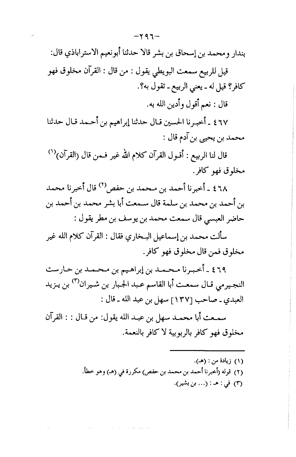 469 - أَخْبَرَنَا مُحَمَّدُ بْنُ إِبْرَاهِيمَ بْنِ مُحَمَّدِ بْنِ حَارَسْتَ النَّجِيرَمِيُّ قَالَ: سَمِعْتُ أَبَا الْقَاسِمِ عَبْدَ الْجَبَّارِ بْنَ شِيرَانَ بْنِ يَزِيدَ الْعَبْدِيَّ صَاحِبَ سَهْلِ بْنِ عَبْدِ اللَّهِ قَالَ: سَمِعْتُ أَبَا مُحَمَّدٍ سَهْلَ بْنَ عَبْدِ اللَّهِ يَقُولُ: §مَنْ قَالَ: الْقُرْآنُ مَخْلُوقٌ؛ فَهُوَ كَافِرٌ بِالرُّبُوبِيَّةِ لَا كَافِرٌ بِالنِّعْمَةِ