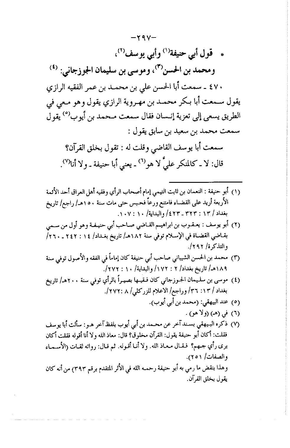 470 - سَمِعْتُ أَبَا الْحَسَنِ عَلِيَّ بْنَ مُحَمَّدِ بْنِ عُمَرَ الْفَقِيهَ الرَّازِيَّ يَقُولُ: سَمِعْتُ أَبَا بَكْرٍ مُحَمَّدَ بْنَ مِهْرَوَيْهِ الرَّازِيَّ يَقُولُ وَهُوَ مَعِي فِي الطَّرِيقِ يَسْعَى إِلَى تَعْزِيَةِ إِنْسَانٍ: سَمِعْتُ مُحَمَّدَ بْنَ أَيُّوبَ يَقُولُ: سَمِعْتُ مُحَمَّدَ بْنَ سَعِيدِ بْنِ سَابِقٍ يَقُولُ: سَمِعْتُ أَبَا يُوسُفَ الْقَاضِيَ وَقُلْتُ لَهُ: §تَقُولُ بِخَلْقِ الْقُرْآنِ؟ قَالَ: لَا. كَالْمُنْكِرُ عَلَى هَؤُلَاءِ يَعْنِي أَبَا حَنِيفَةَ وَلَا أَنَا