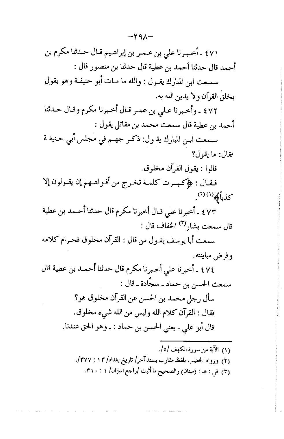 472 - وَأَخْبَرَنَا عَلِيُّ بْنُ عُمَرَ قَالَ: أَخْبَرَنَا مُكْرَمٌ , وَقَالَ: حَدَّثَنَا أَحْمَدُ بْنُ عَطِيَّةَ قَالَ: سَمِعْتُ مُحَمَّدَ بْنَ مُقَاتِلٍ يَقُولُ: سَمِعْتُ ابْنَ الْمُبَارَكِ يَقُولُ: ذُكِرَ جَهْمٌ فِي مَجْلِسِ أَبِي حَنِيفَةَ فَقَالَ: مَا يَقُولُ؟ قَالُوا: §يَقُولُ الْقُرْآنُ مَخْلُوقٌ. فَقَالَ: {كَبُرَتْ كَلِمَةً تَخْرُجُ مِنْ أَفْوَاهِهِمْ إِنْ يَقُولُونَ إِلَّا كَذِبًا} [الكهف: 5]
