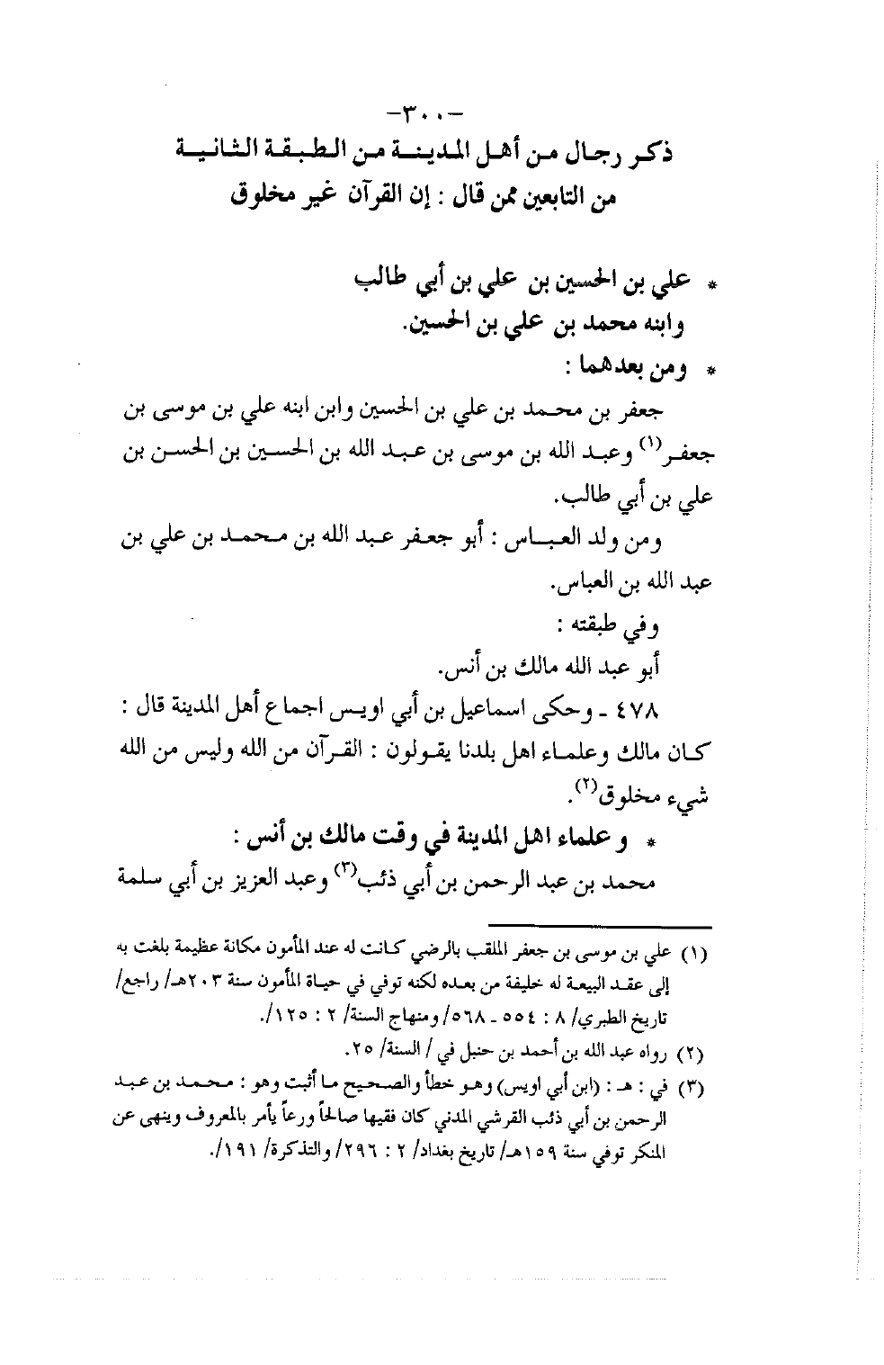 §عَلِيُّ بْنُ الْحُسَيْنِ بْنِ عَلِيِّ بْنِ أَبِي طَالِبٍ , وَابْنُهُ مُحَمَّدُ بْنُ عَلِيِّ بْنِ الْحُسَيْنِ وَمِنْ بَعْدِهِمَا جَعْفَرُ بْنُ مُحَمَّدِ بْنِ عَلِيِّ بْنِ الْحُسَيْنِ , وَابْنُ ابْنِهِ عَلِيُّ بْنُ مُوسَى بْنِ جَعْفَرٍ , وَعَبْدُ اللَّهِ بْنُ مُوسَى بْنِ عَبْدِ اللَّهِ بْنِ الْحُسَيْنِ بْنِ الْحَسَنِ بْنِ عَلِيِّ بْنِ أَبِي طَالِبٍ. وَمِنْ وَلَدِ الْعَبَّاسِ: أَبُو جَعْفَرٍ عَبْدُ اللَّهِ بْنُ مُحَمَّدِ بْنِ عَلِيِّ بْنِ عَبْدِ اللَّهِ بْنِ الْعَبَّاسِ. وَفِي طَبَقَتِهِ: أَبُو عَبْدِ اللَّهِ مَالِكُ بْنُ أَنَسٍ.