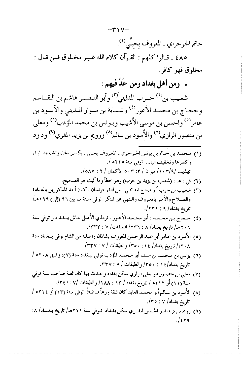 §وَمِنْ أَهْلِ بَغْدَادَ وَمَنْ عُدَّ فِيهِمْ شُعَيْبُ بْنُ حَرْبٍ الْمَدَائِنِيُّ , وَأَبُو النَّضْرِ هَاشِمُ بْنُ الْقَاسِمِ , وَحَجَّاجُ بْنُ مُحَمَّدٍ الْأَعْوَرُ , وَشَبَابَةُ بْنُ سَوَّارٍ الْمَدَائِنِيُّ , وَالْأَسْوَدُ بْنُ عَامِرٍ , وَالْحَسَنُ بْنُ مُوسَى الْأَشْيَبُ , وَيُونُسُ بْنُ مُحَمَّدٍ الْمُؤَدِّبُ , وَمُعَلَّى بْنُ مَنْصُورٍ الرَّازِيُّ , وَالْأَسْوَدُ بْنُ سَالِمٍ , وَرُوَيْمُ بْنُ يَزِيدَ الْمُقْرِئُ , وَدَاوُدُ -[318]- بْنُ الْمُحَبَّرِ , وَعَفَّانُ بْنُ مُسْلِمٍ , وَخَالِدُ بْنُ خِدَاشٍ , وَمُعَاوِيَةُ بْنُ عَمْرٍو , وَسُلَيْمَانُ بْنُ دَاوُدَ الْهَاشِمِيُّ , وَأَبُو مُسْلِمٍ عَبْدُ الرَّحْمَنِ بْنُ يُونُسَ الْمُسْتَمْلِي , وَمُحَمَّدُ بْنُ يُوسُفَ الطَّبَّاعُ , وَأَبُو السَّرِيِّ سَهْلُ بْنُ مَحْمُودٍ , وَهِشَامُ بْنُ بَهْرَامَ الْمَدَائِنِيُّ , وَأَبُو نَصْرٍ عَبْدُ الْمَلِكِ بْنُ عَبْدِ الْعَزِيزِ التَّمَّارُ , وَأَبُو إِبْرَاهِيمَ إِسْمَاعِيلُ بْنُ إِبْرَاهِيمَ التَّرْجُمَانِيُّ , -[319]- وَعَبْدُ الْعَزِيزِ بْنُ أَبِي سَلَمَةَ الْعُمَرِيُّ نَزِيلُ بَغْدَادَ , وَالْحَكَمُ بْنُ مُوسَى , وَالْوَلِيدُ بْنُ صَالِحٍ الْجَزَرِيُّ , وَعُبَيْدُ اللَّهِ بْنُ عُمَرَ الْقَوَارِيرِيُّ , وَمُحْرِزُ بْنُ عَوْنٍ , وَسُوَيْدُ بْنُ سَعِيدٍ , وَيَحْيَى بْنُ أَيُّوبَ الزَّاهِدُ , وَبِشْرُ بْنُ الْحَارِثِ الزَّاهِدُ , وَسُرَيْجُ بْنُ يُونُسَ , وَدَاوُدُ بْنُ رُشَيْدٍ , وَمُحَمَّدُ بْنُ بَكَّارِ بْنِ الرَّيَّانِ , وَأَحْمَدُ بْنُ حَنْبَلٍ , وَيَحْيَى بْنُ مَعِينٍ , وَزُهَيْرُ بْنُ حَرْبٍ , وَأَبُو عُبَيْدٍ الْقَاسِمُ بْنُ سَلَّامٍ , وَأَبُو ثَوْرٍ إِبْرَاهِيمُ بْنُ خَالِدٍ الْكَلْبِيُّ , وَأَحْمَدُ بْنُ -[320]- حَاتِمٍ الطَّوِيلُ , وَأَبُو مَعْمَرٍ إِسْمَاعِيلُ بْنُ إِبْرَاهِيمَ الْقَطِيعِيُّ , وَمُحَمَّدُ بْنُ مُصْعَبٍ الْبَكَّاءُ الْعَابِدُ , وَإِبْرَاهِيمُ بْنُ أَبِي اللَّيْثِ خَتَنُ الْأَشْجَعِيِّ , وَأَبُو هَمَّامٍ الْوَلِيدُ بْنُ شُجَاعٍ , وَأَبُو بَكْرِ بْنُ أَبِي النَّضْرِ , وَالْحَسَنُ بْنُ الصَّبَّاحِ الْبَزَّارُ , وَيَعْقُوبُ وَأَحْمَدُ ابْنَا إِبْرَاهِيمَ الدَّوْرَقَانِيِّ , وَزِيَادُ بْنُ أَيُّوبَ , وَيَحْيَى بْنُ أَكْثَمَ , وَعَلِيُّ بْنُ مُسْلِمٍ الطُّوسِيُّ , وَأَبُو سَعِيدٍ أَحْمَدُ بْنُ زِيَادٍ الْحَدَّادُ الْوَاسِطِيُّ , وَهَارُونُ بْنُ -[321]- عَبْدِ اللَّهِ الْحَمَّالُ , وَسَعِيدُ بْنُ يَحْيَى بْنِ سَعِيدٍ الْأُمَوِيُّ , وَصَالِحٌ الْخَزَّازُ , وَعَبْدُ اللَّهِ بْنُ هَاشِمِ بْنِ حَيَّانَ الطُّوسِيُّ نَزِيلُ بَغْدَادَ , وَهَارُونُ الْمُسْتَمْلِي , وَمُحَمَّدُ بْنُ مَنْصُورٍ الطُّوسِيُّ , وَأَبُو يَحْيَى مُحَمَّدُ بْنُ عَبْدِ الرَّحْمَنِ الْبَزَّازُ , وَعَبْدُ الْوَهَّابِ بْنُ الْحَكَمِ الْوَرَّاقُ , وَإِبْرَاهِيمُ بْنُ نُصَيْرٍ , وَالْحَسَنُ بْنُ إِبْرَاهِيمَ الشَّامِيُّ الْمَدَنِيُّ نَزِيلُ بَغْدَادَ , وَإِسْحَاقُ بْنُ دَاوُدَ الشَّعْرَانِيُّ , وَالْحَسَنُ بْنُ عَرَفَةَ , وَعَلِيُّ بْنُ الْحُسَيْنِ -[322]- بْنِ إِبْرَاهِيمَ بْنِ إِشْكَابٍ , وَمَحْفُوظُ بْنُ أَبِي تَوْبَةَ , وَأَبُو طَالِبٍ أَحْمَدُ بْنُ حُمَيْدٍ الْوَرَّاقُ , وَإِبْرَاهِيمُ بْنُ شَدَّادٍ , وَمُحَمَّدُ بْنُ سُهَيْلِ بْنِ عَسْكَرٍ الْبُخَارِيُّ , وَزُهَيْرُ بْنُ مُحَمَّدِ بْنِ قُمَيْرٍ , وَيَعِيشُ بْنُ الْجَهْمِ الْحَدِيثِيُّ , وَأَبُو بَكْرٍ أَحْمَدُ بْنُ مُحَمَّدِ بْنِ هَانِي الْأَثْرَمُ , وَالْفَضْلُ بْنُ زِيَادٍ الطُّوسِيُّ , وَمُحَمَّدُ بْنُ عَبْدِ الْمَلِكِ زَنْجُوَيْهِ , وَحَرْبُ بْنُ إِسْمَاعِيلَ الْكَرْمَانِيُّ , أَرْبَعَتُهُمْ أَصْحَابُ أَحْمَدَ بْنِ حَنْبَلٍ , وَالْفَضْلُ بْنُ -[323]- سَهْلٍ الْأَعْرَجُ , 