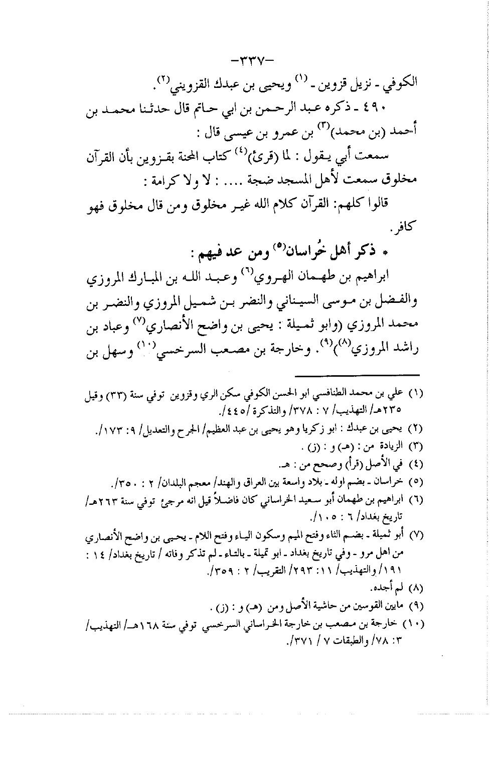 §ذِكْرُ أَهْلِ خُرَاسَانَ وَمَنْ عُدَّ فِيهِمْ إِبْرَاهِيمُ بْنُ طَهْمَانَ الْهَرَوِيُّ , وَعَبْدُ اللَّهِ بْنُ الْمُبَارَكِ الْمَرْوَزِيُّ , وَالْفَضْلُ بْنُ مُوسَى السِّينَانِيُّ , وَالنَّضْرُ بْنُ شُمَيْلٍ الْمَرْوَزِيُّ , وَالنَّضْرُ بْنُ مُحَمَّدٍ الْمَرْوَزِيُّ , وَأَبُو ثُمَيْلَةُ يَحْيَى بْنُ وَاضِحٍ الْأَنْصَارِيُّ , وَعَبَّادُ بْنُ رَاشِدٍ الْمَرْوَزِيُّ , وَخَارِجَةُ بْنُ مُصْعَبٍ السَّرَخْسِيُّ , وَسَهْلُ -[338]- بْنُ مُزَاحِمٍ الْمَرْوَزِيُّ , وَعَبْدُ اللَّهِ بْنُ عُثْمَانَ , وَعَلِيُّ بْنُ الْحَسَنِ بْنِ شَقِيقٍ , وَأَبُو مُعَاذٍ خَالِدُ بْنُ سُلَيْمَانَ الْبَلْخِيُّ , وَمُعَاذُ بْنُ خَالِدٍ السِّنْجِيُّ , وَأَحْمَدُ بْنُ شَبُّوَيْهِ الْمَرْوَزِيُّ , وَإِسْحَاقُ بْنُ رَاهَوَيْهِ , وَصَدَقَةُ بْنُ الْفَضْلِ الْمَرْوَزِيُّ , وَعَلِيُّ بْنُ حُجْرٍ السَّعْدِيُّ , وَعَبْدَةُ بْنُ عَبْدِ الرَّحِيمِ , وَأَبُو عَقِيلٍ مُحَمَّدُ بْنُ حَاجِبٍ الْمَرْوَزِيُّ , وَأَبُو عَمَّارٍ الْحُسَيْنُ بْنُ حُرَيْثٍ الْمَرْوَزِيُّ , وَمَحْمُودُ بْنُ غَيْلَانَ , وَمُحَمَّدُ بْنُ عَبْدِ الْعَزِيزِ -[339]- بْنِ أَبِي رِزْمَةَ , وَمُحَمَّدُ بْنُ عَلِيِّ بْنِ الْحَسَنِ بْنِ شَقِيقٍ , وَعَلِيُّ بْنُ خَشْرَمٍ , وَصَالِحُ بْنُ مِسْمَارٍ , وَأَحْمَدُ بْنُ مَنْصُورٍ زَاجٌ , وَسُلَيْمَانُ بْنُ مَعْبَدٍ السِّنْجِيُّ.