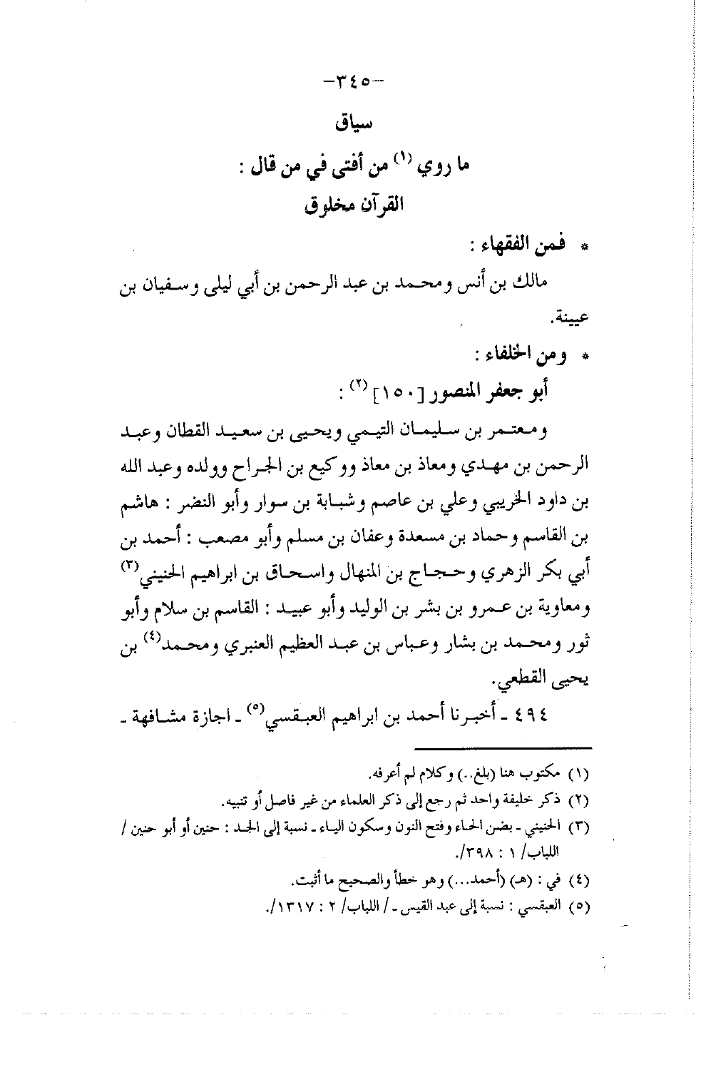 §سِيَاقُ مَا رُوِيَ عَنْ مَنْ أَفْتَى فِي مَنْ قَالَ: الْقُرْآنُ مَخْلُوقٌ