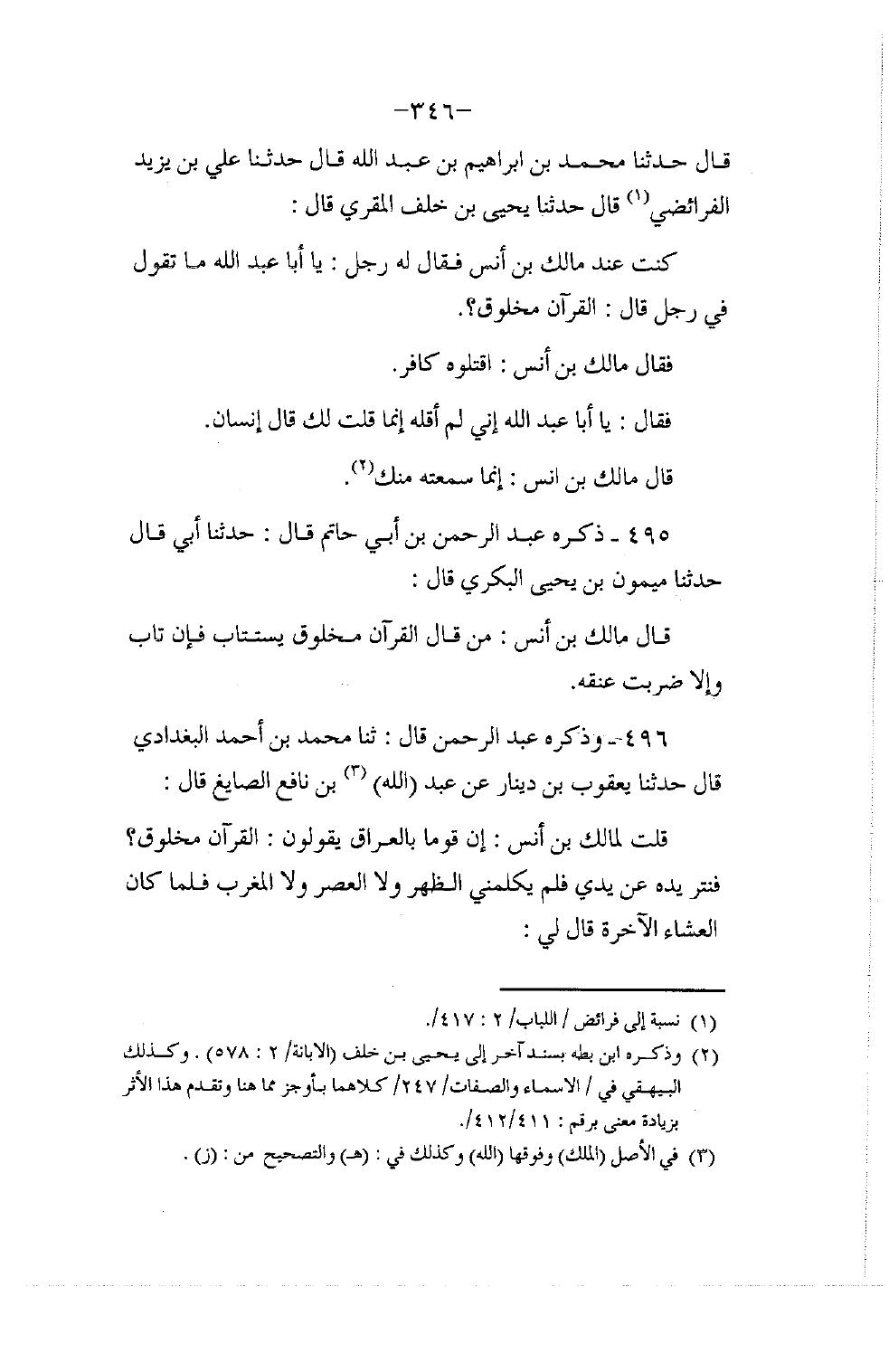 496 - وَذَكَرَهُ عَبْدُ الرَّحْمَنِ قَالَ: ثنا مُحَمَّدُ بْنُ أَحْمَدَ الْبَغْدَادِيُّ قَالَ: حَدَّثَنَا يَعْقُوبُ بْنُ دِينَارٍ , عَنْ عَبْدِ اللَّهِ بْنِ نَافِعٍ الصَّايِغِ قَالَ: قُلْتُ لِمَالِكِ بْنِ أَنَسٍ: إِنَّ قَوْمًا بِالْعِرَاقِ يَقُولُونَ: الْقُرْآنُ مَخْلُوقٌ. فَنَتَرَ يَدَهُ عَنْ يَدِي فَلَمْ يُكَلِّمْنِي الظُّهْرَ وَلَا الْعَصْرَ وَلَا الْمَغْرِبَ , فَلَمَّا كَانَ الْعِشَاءُ الْآخِرَةُ قَالَ لِي -[347]-: يَا عَبْدَ اللَّهِ بْنَ نَافِعٍ مِنْ أَيْنَ لَكَ هَذَا الْكَلَامُ؟ أَلْقَيْتَ فِي قَلْبِي شَيْئًا هُوَ الْكُفْرُ , صَاحِبُ هَذَا الْكَلَامِ يُقْتَلُ وَلَا يُسْتَتَابُ.