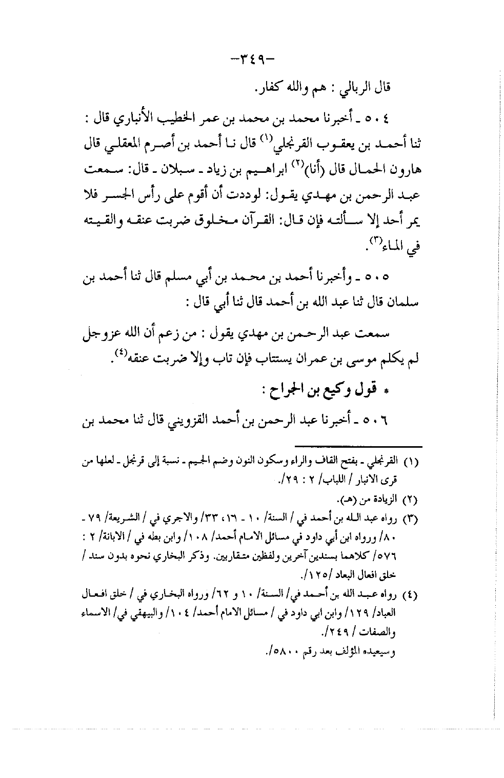 506 - أَخْبَرَنَا عَبْدُ الرَّحْمَنِ بْنُ أَحْمَدَ الْقَزْوِينِيُّ قَالَ: ثنا مُحَمَّدُ بْنُ -[350]- عَلِيِّ بْنِ مُحَمَّدِ بْنِ عَامِرٍ النَّهَاوَنْدِيُّ قَالَ: ثنا أَحْمَدُ بْنُ عَبْدِ اللَّهِ وَكِيلُ أَبِي صَخْرَةَ قَالَ: ثنا إِبْرَاهِيمُ بْنُ الْجُنَيْدِ قَالَ: حَدَّثَنِي الْقَاسِمُ بْنُ يَزِيدَ الْأَشْجَعِيُّ أَبُو مُحَمَّدٍ قَالَ: سَمِعْتُ وَكِيعَ بْنَ الْجَرَّاحِ يَقُولُ: §مَنْ زَعَمَ أَنَّ الْقُرْآنَ مَخْلُوقٌ فَقَدْ زَعَمَ أَنَّ الْقُرْآنَ مُحْدَثٌ , وَمَنْ زَعَمَ أَنَّ الْقُرْآنَ مُحْدَثٌ فَقَدْ كَفَرَ بِمَا أَنْزَلَ اللَّهُ عَلَى مُحَمَّدٍ صَلَّى اللهُ عَلَيْهِ وَسَلَّمَ , يُسْتَتَابُ , فَإِنْ تَابَ وَإِلَّا ضُرِبَتْ عُنُقُهُ