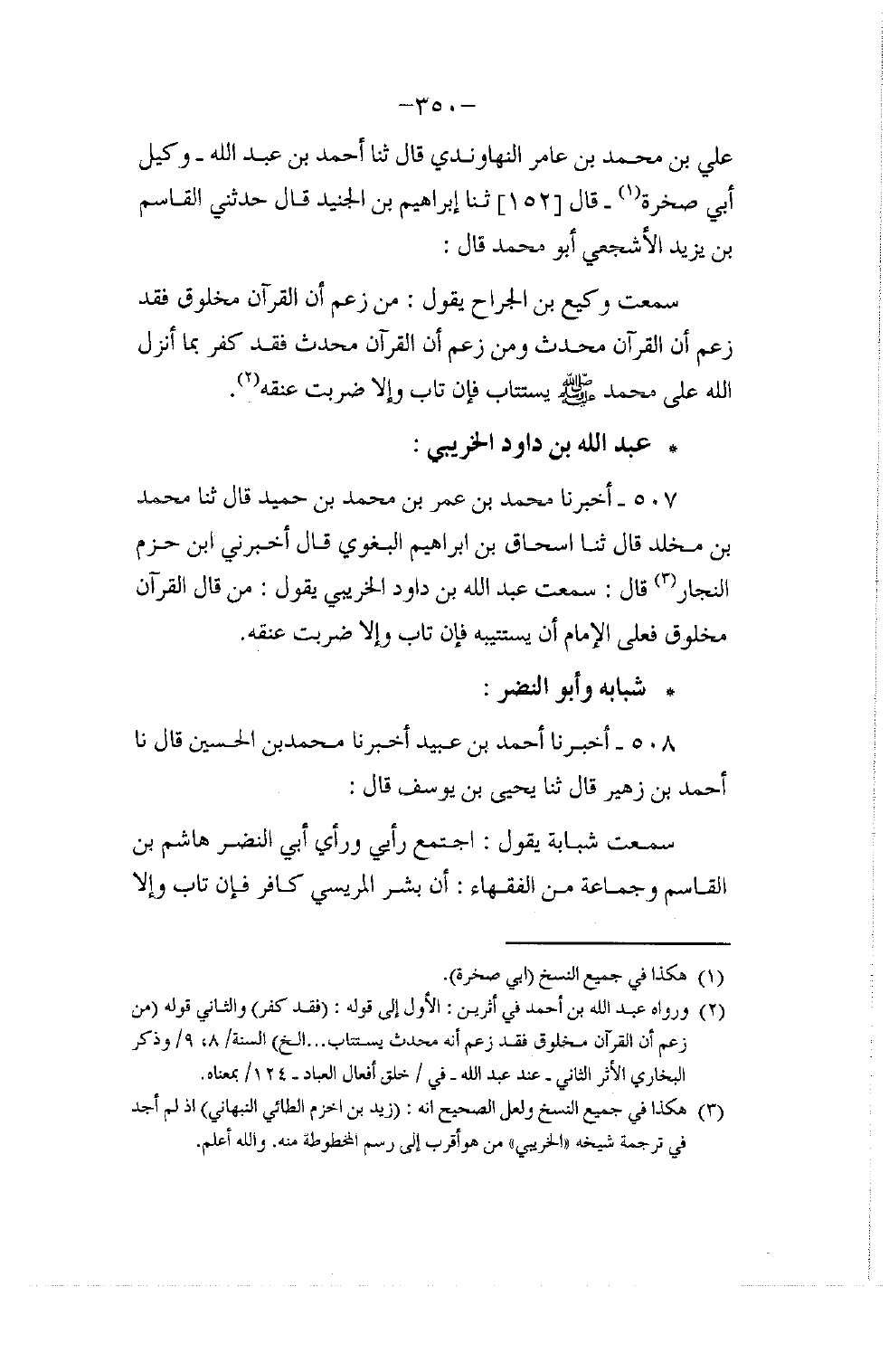 507 - أَخْبَرَنَا مُحَمَّدُ بْنُ عُمَرَ بْنِ مُحَمَّدِ بْنِ حُمَيْدٍ قَالَ: ثنا مُحَمَّدُ بْنُ مَخْلَدٍ قَالَ: ثنا إِسْحَاقُ بْنُ إِبْرَاهِيمَ الْبَغَوِيُّ قَالَ: أَخْبَرَنِي ابْنُ حَزْمٍ النَّجَّارُ قَالَ: سَمِعْتُ عَبْدَ اللَّهِ بْنَ دَاوُدَ الْخُرَيْبِيَّ يَقُولُ: مَنْ قَالَ: §الْقُرْآنُ مَخْلُوقٌ , فَعَلَى الْإِمَامِ أَنْ يَسْتَتِيبَهُ , فَإِنْ تَابَ وَإِلَّا ضُرِبَتْ عُنُقُهُ