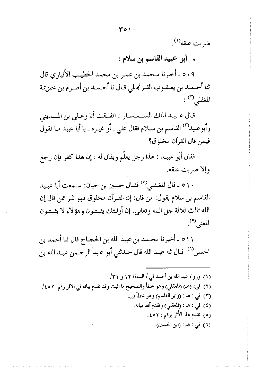 509 - أَخْبَرَنَا مُحَمَّدُ بْنُ عُمَرَ بْنِ مُحَمَّدٍ الْخَطِيبُ الْأَنْبَارِيُّ قَالَ: ثنا أَحْمَدُ بْنُ يَعْقُوبَ الْقَرَنْجُلِيُّ قَالَ: نا أَحْمَدُ بْنُ أَصْرَمَ بْنِ خُزَيْمَةَ الْمُغَفَّلِيُّ: قَالَ عَبْدُ الْمَلِكِ السِّمْسَارُ: اتَّفَقْتُ أَنَا وَعَلِيُّ بْنُ الْمَدِينِيِّ , وَأَبُو عُبَيْدٍ الْقَاسِمُ بْنُ سَلَّامٍ , فَقَالَ عَلِيٌّ أَوْ غَيْرُهُ: يَا أَبَا عُبَيْدٍ , مَا تَقُولُ فِيمَنْ قَالَ §الْقُرْآنُ مَخْلُوقٌ؟ فَقَالَ أَبُو عُبَيْدٍ: هَذَا رَجُلٌ يُعَلَّمُ وَيُقَالُ لَهُ: إِنَّ هَذَا كُفْرٌ , فَإِنْ رَجَعَ وَإِلَّا ضُرِبَتْ عُنُقُهُ