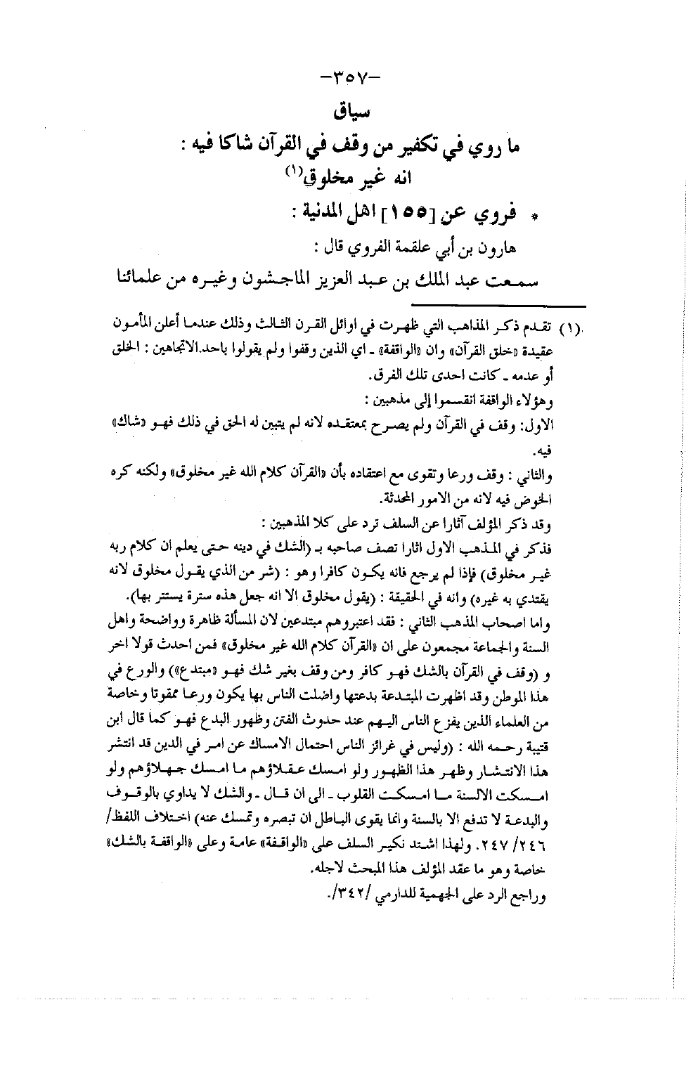 §فَرَوَى عَنْ أَهْلِ الْمَدِينَةِ هَارُونُ بْنُ أَبِي عَلْقَمَةَ الْفَرْوِيُّ قَالَ: سَمِعْتُ عَبْدَ الْمَلِكِ بْنَ عَبْدِ الْعَزِيزِ الْمَاجِشُونَ وَغَيْرَهُ مِنْ عُلَمَائِنَا -[358]- يَقُولُونَ: مَنْ وَقَفَ فِي الْقُرْآنِ بِالشَّكِّ فَهُوَ كَافِرٌ. قَالَ: وَسَمِعْتُ عَبْدَ الْمَلِكِ خَاصَّةً يَقُولُ: مَنْ وَقَفَ فِي الْقُرْآنِ بِالشَّكِّ فَهُوَ مِثْلُ مَنْ قَالَ مَخْلُوقٌ.