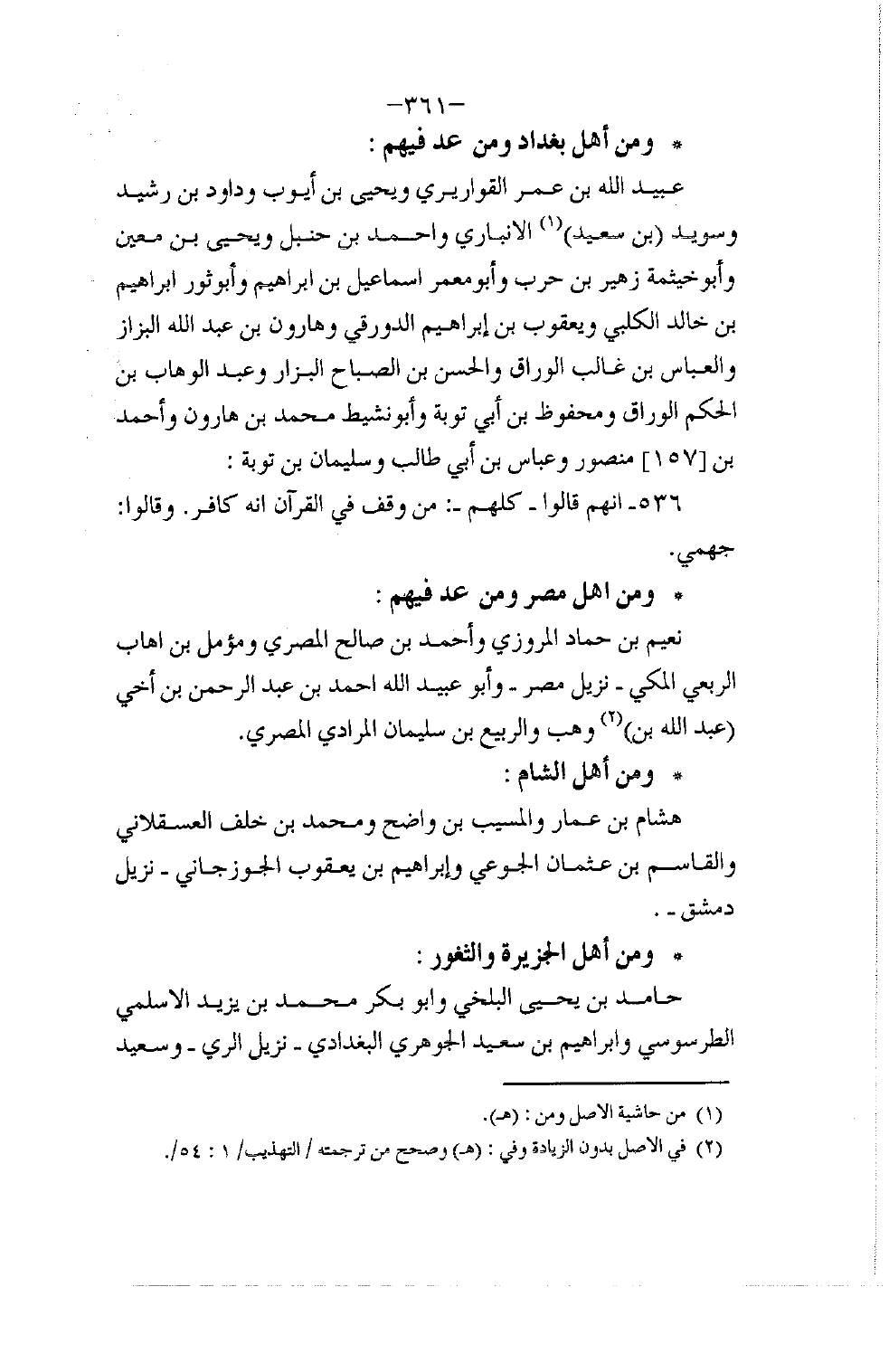§وَمِنْ أَهْلِ بَغْدَادَ وَمَنْ عُدَّ فِيهِمْ عُبَيْدُ اللَّهِ بْنُ عُمَرَ الْقَوَارِيرِيُّ , وَيَحْيَى بْنُ أَيُّوبَ , وَدَاوُدُ بْنُ رُشَيْدٍ , وَسُوَيْدُ بْنُ سَعِيدٍ الْأَنْبَارِيُّ , وَأَحْمَدُ بْنُ حَنْبَلٍ , وَيَحْيَى بْنُ مَعِينٍ , وَأَبُو خَيْثَمَةَ زُهَيْرُ بْنُ حَرْبٍ , وَأَبُو مَعْمَرٍ إِسْمَاعِيلُ بْنُ إِبْرَاهِيمَ , وَأَبُو ثَوْرٍ إِبْرَاهِيمُ بْنُ خَالِدٍ الْكَلْبِيُّ , وَيَعْقُوبُ بْنُ إِبْرَاهِيمَ الدَّوْرَقِيُّ , وَهَارُونُ بْنُ عَبْدِ اللَّهِ الْبَزَّازُ , وَالْعَبَّاسُ بْنُ غَالِبٍ الْوَرَّاقُ , وَالْحَسَنُ بْنُ الصَّبَّاحِ الْبَزَّارُ , وَعَبْدُ الْوَهَّابِ بْنُ الْحَكَمِ الْوَرَّاقُ , وَمَحْفُوظُ بْنُ أَبِي تَوْبَةَ , وَأَبُو نَشِيطٍ مُحَمَّدُ بْنُ هَارُونَ , وَأَحْمَدُ بْنُ مَنْصُورٍ , وَعَبَّاسُ بْنُ أَبِي طَالِبٍ , وَسُلَيْمَانُ بْنُ تَوْبَةَ