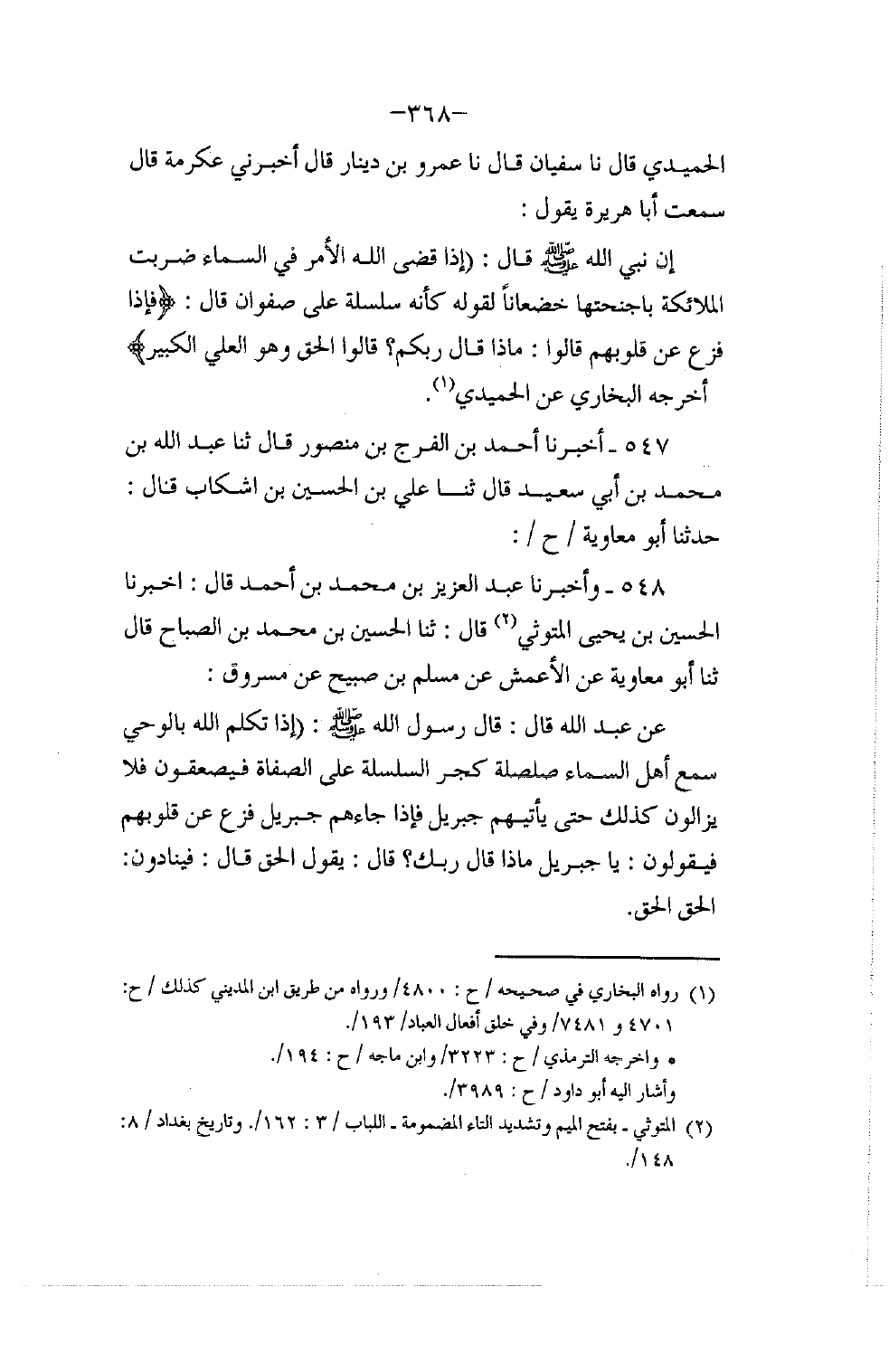 548 - وَأَخْبَرَنَا عَبْدُ الْعَزِيزِ بْنُ مُحَمَّدِ بْنِ أَحْمَدَ قَالَ: أَخْبَرَنَا الْحُسَيْنُ بْنُ يَحْيَى الْمَتُّوثِيُّ قَالَ: ثنا الْحَسَنُ بْنُ مُحَمَّدِ بْنِ الصَّبَّاحِ قَالَ: ثنا أَبُو مُعَاوِيَةَ , عَنِ الْأَعْمَشِ , عَنْ مُسْلِمِ بْنِ صُبَيْحٍ , عَنْ مَسْرُوقٍ , عَنْ عَبْدِ اللَّهِ قَالَ: قَالَ رَسُولُ اللَّهِ صَلَّى اللهُ عَلَيْهِ وَسَلَّمَ: §" إِذَا تَكَلَّمَ اللَّهُ بِالْوَحْيِ سَمِعَ أَهْلُ السَّمَاءِ صَلْصَلَةً كَجَرِّ السِّلْسِلَةِ عَلَى الصَّفَاةِ فَيُصْعَقُونَ , فَلَا يَزَالُونَ كَذَلِكَ حَتَّى يَأْتِيَهُمْ جِبْرِيلُ , فَإِذَا جَاءَهُمْ جِبْرِيلُ فُزِّعَ عَنْ قُلُوبِهِمْ فَيَقُولُونَ: يَا جِبْرِيلُ , مَاذَا قَالَ رَبُّكَ؟ قَالَ: يَقُولُ الْحَقَّ. قَالَ: فَيُنَادُونَ: الْحَقَّ الْحَقَّ -[369]-. زَادَ ابْنُ أَبِي سَعِيدٍ الْحَقَّ مِثْلَهُ. أَخْرَجَهُ أَبُو دَاوُدَ عَنْ أَحْمَدَ بْنِ أَبِي سُرَيْجٍ , وَعَلِيِّ بْنِ الْحُسَيْنِ بْنِ إِبْرَاهِيمَ , وَعَلِيِّ بْنِ أَبِي مُسْلِمٍ , عَنْ أَبِي مُعَاوِيَةَ مُسْنَدًا. وَرَوَاهُ الْمُحَارِبِيُّ، وَجَرِيرٌ , وَابْنُ نُمَيْرٍ مِنْ قَوْلِ ابْنِ مَسْعُودٍ , وَرَوَاهُ أَحْمَدُ بْنُ حَنْبَلٍ , عَنْ أَبِي مُعَاوِيَةَ مَوْقُوفًا