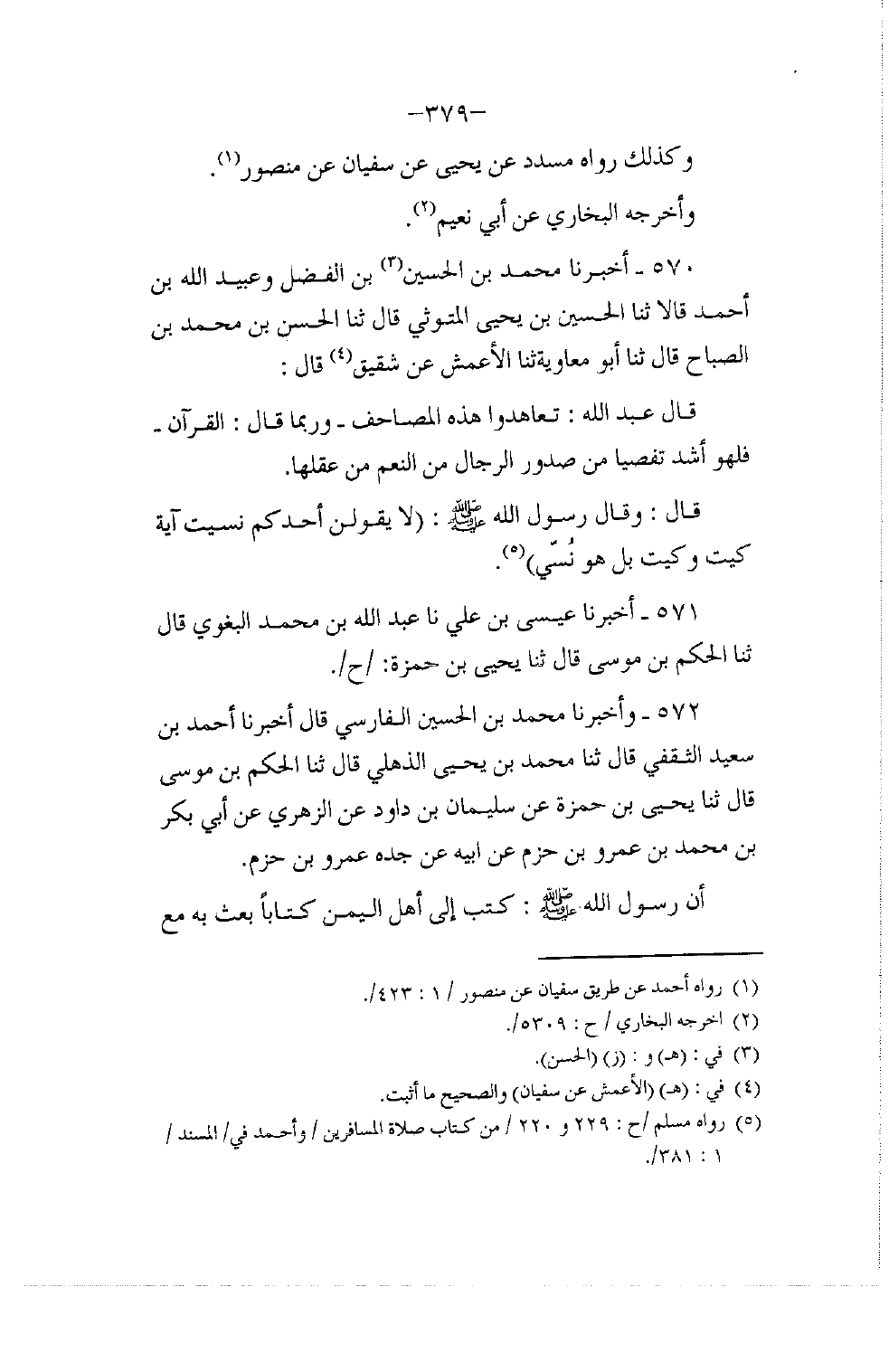 572 - وَأَخْبَرَنَا مُحَمَّدُ بْنُ الْحُسَيْنِ الْفَارِسِيُّ قَالَ: أَخْبَرَنَا أَحْمَدُ بْنُ سَعِيدٍ الثَّقَفِيُّ قَالَ: ثنا مُحَمَّدُ بْنُ يَحْيَى الذُّهْلِيُّ قَالَ: ثنا الْحَكَمُ بْنُ مُوسَى قَالَ: ثنا يَحْيَى بْنُ حَمْزَةَ , عَنْ سُلَيْمَانَ بْنِ دَاوُدَ , عَنِ الزُّهْرِيِّ , عَنْ أَبِي بَكْرِ بْنِ مُحَمَّدِ بْنِ عَمْرِو بْنِ حَزْمٍ , عَنْ أَبِيهِ , عَنْ جَدِّهِ عَمْرِو بْنِ حَزْمٍ أَنَّ رَسُولَ اللَّهِ صَلَّى اللهُ عَلَيْهِ وَسَلَّمَ كَتَبَ إِلَى أَهْلِ الْيَمَنِ كِتَابًا بَعَثَ بِهِ مَعَ -[380]- عَمْرِو بْنِ حَزْمٍ «أَنْ §لَا يَمَسَّ الْقُرْآنَ إِلَّا طَاهِرٌ» .