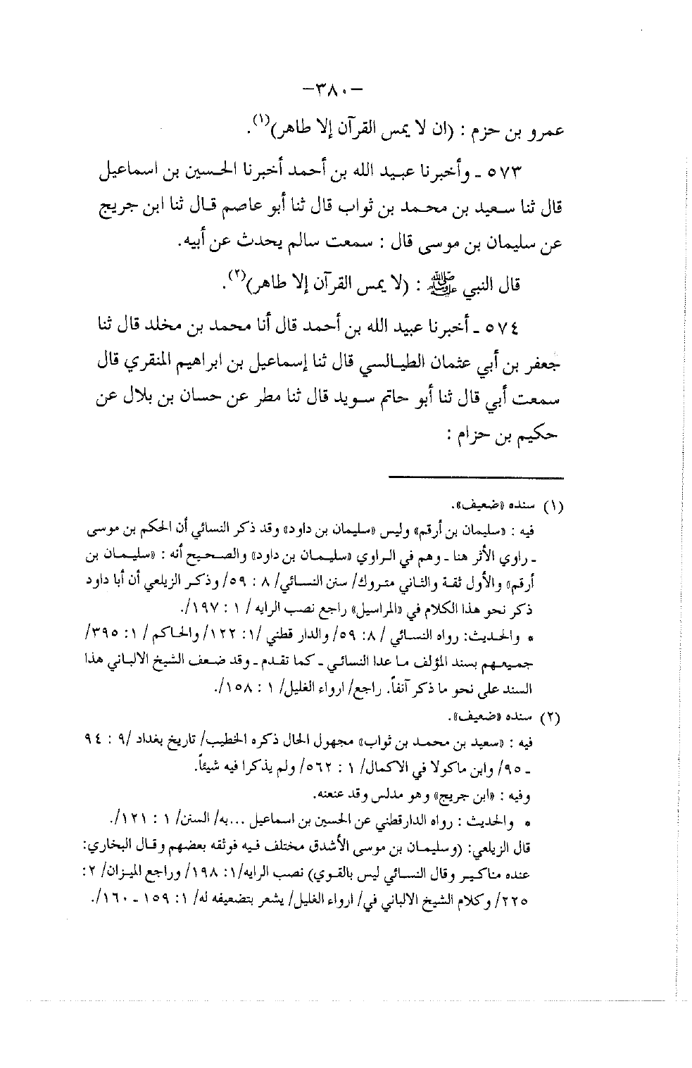 573 - وَأَخْبَرَنَا عُبَيْدُ اللَّهِ بْنُ أَحْمَدَ , أَخْبَرَنَا الْحُسَيْنُ بْنُ إِسْمَاعِيلَ قَالَ: ثنا سَعِيدُ بْنُ مُحَمَّدِ بْنِ ثَوَابٍ قَالَ: ثنا أَبُو عَاصِمٍ قَالَ: ثنا ابْنُ جُرَيْجٍ , عَنْ سُلَيْمَانَ بْنِ مُوسَى قَالَ سَمِعْتُ سَالِمًا يُحَدِّثُ عَنْ أَبِيهِ , قَالَ النَّبِيُّ صَلَّى اللهُ عَلَيْهِ وَسَلَّمَ: §«لَا يَمَسَّ الْقُرْآنَ إِلَّا طَاهِرٌ»