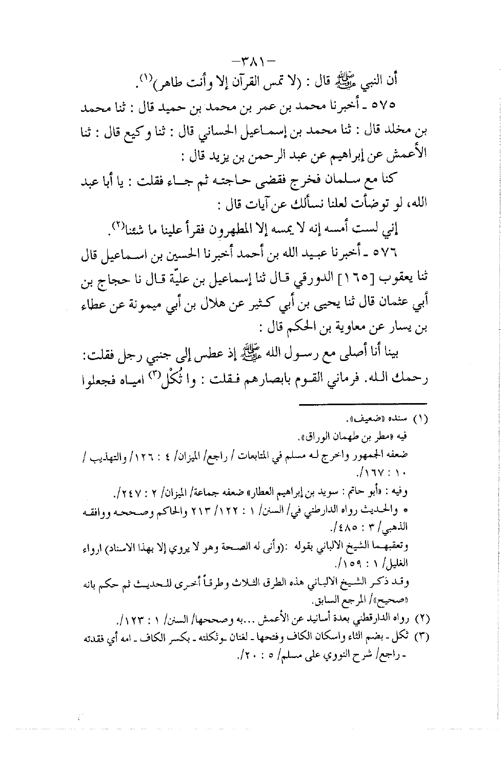 575 - أَخْبَرَنَا مُحَمَّدُ بْنُ عُمَرَ بْنِ مُحَمَّدِ بْنِ حُمَيْدٍ قَالَ: ثنا مُحَمَّدُ بْنُ مَخْلَدٍ قَالَ: ثنا مُحَمَّدُ بْنُ إِسْمَاعِيلَ الْحَسَّانِيُّ قَالَ: ثنا وَكِيعٌ قَالَ: ثنا الْأَعْمَشُ , عَنْ إِبْرَاهِيمَ , عَنْ عَبْدِ الرَّحْمَنِ بْنِ يَزِيدَ قَالَ: كُنَّا مَعَ سَلْمَانَ فَخَرَجَ فَقَضَى حَاجَتَهُ ثُمَّ جَاءَ فَقُلْتُ: يَا أَبَا عَبْدِ اللَّهِ لَوْ تَوَضَّأْتَ لَعَلَّنَا نَسْأَلُكَ عَنْ آيَاتٍ. قَالَ: «إِنِّي §لَسْتُ أَمَسُّهُ؛ إِنَّهُ لَا يَمَسُّهُ إِلَّا الْمُطَهَّرُونَ. فَقَرَأَ عَلَيْنَا مَا شِئْنَا»