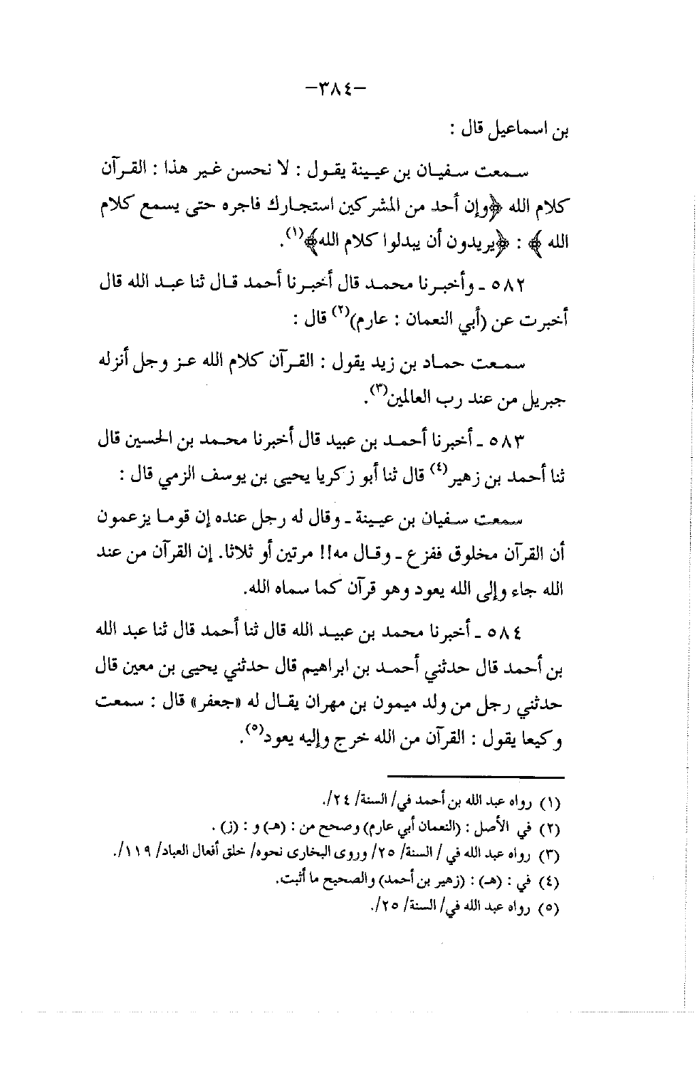582 - وَأَخْبَرَنَا مُحَمَّدٌ قَالَ: أَخْبَرَنَا أَحْمَدُ قَالَ: ثنا عَبْدُ اللَّهِ قَالَ: أُخْبِرْتُ عَنْ أَبِي النُّعْمَانِ عَارِمٍ قَالَ: سَمِعْتُ حَمَّادَ بْنَ زَيْدٍ يَقُولُ: §الْقُرْآنُ كَلَامُ اللَّهِ عَزَّ وَجَلَّ , أَنْزَلَهُ جِبْرِيلُ مِنْ عِنْدِ رَبِّ الْعَالَمِينَ