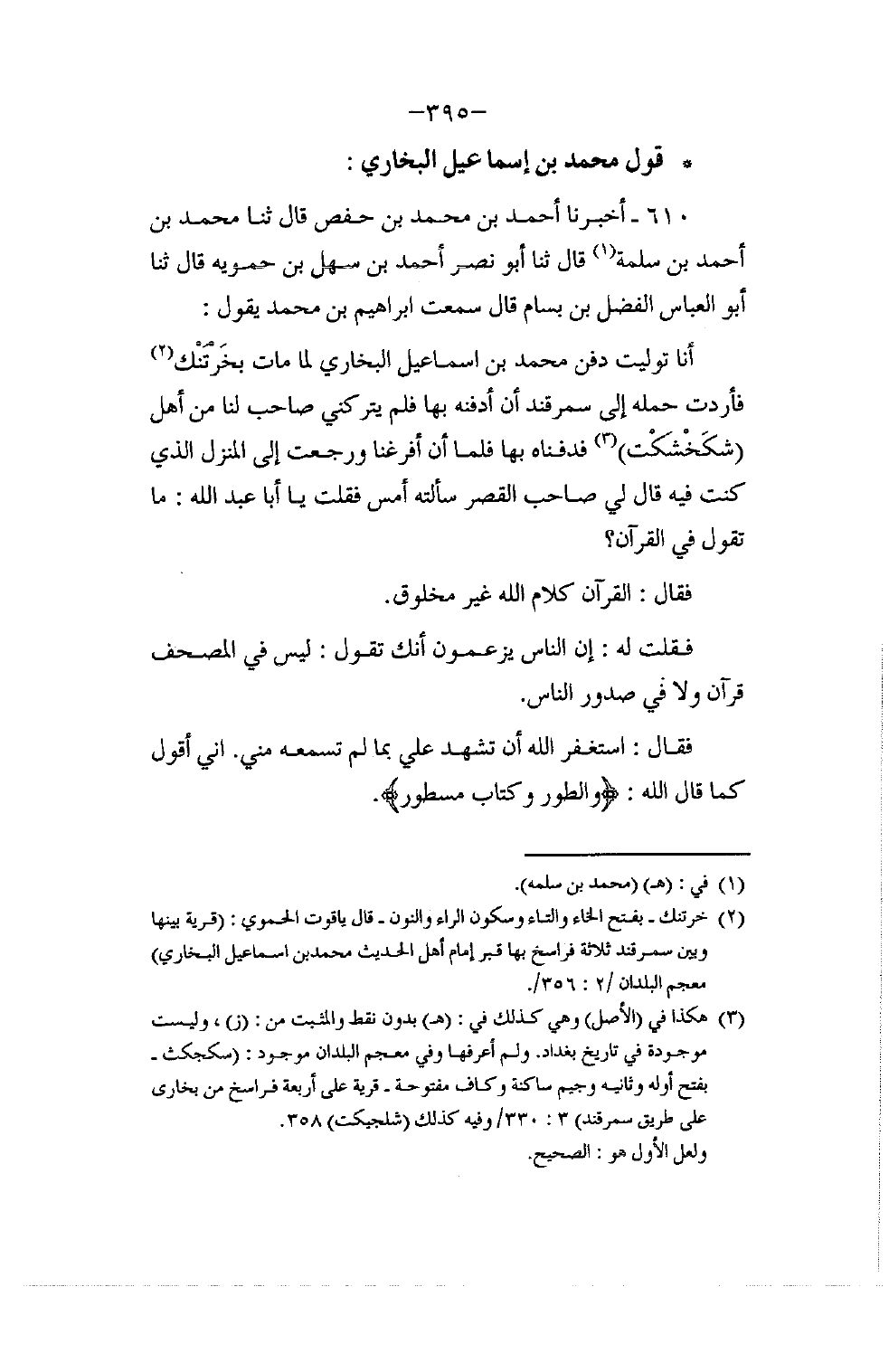 610 - أَخْبَرَنَا أَحْمَدُ بْنُ مُحَمَّدِ بْنِ حَفْصٍ قَالَ: ثنا مُحَمَّدُ بْنُ أَحْمَدَ بْنِ سَلَمَةَ قَالَ: ثنا أَبُو نَصْرٍ أَحْمَدُ بْنُ سَهْلِ بْنِ حَمْدَوَيْهِ قَالَ: ثنا أَبُو الْعَبَّاسِ الْفَضْلُ بْنُ بَسَّامٍ قَالَ: سَمِعْتُ إِبْرَاهِيمَ بْنَ مُحَمَّدٍ يَقُولُ: أَنَا تَوَلَّيْتُ دَفْنَ مُحَمَّدِ بْنِ إِسْمَاعِيلَ الْبُخَارِيِّ لَمَّا مَاتَ بِخَرْتَنْكَ , فَأَرَدْتُ حَمْلَهُ إِلَى سَمَرْقَنْدَ أَنْ أَدْفِنَهُ بِهَا , فَلَمْ يَتْرُكْنِي صَاحِبٌ لَنَا مِنْ أَهْلِ سَكَجْكَثَ فَدَفَنَّاهُ بِهَا , فَلَمَّا أَنْ فَرَغْنَا وَرَجَعْتُ إِلَى الْمَنْزِلِ الَّذِي كُنْتُ فِيهِ قَالَ لِي صَاحِبُ الْقَصْرِ: سَأَلْتُهُ أَمْسِ فَقُلْتُ: يَا أَبَا عَبْدِ اللَّهِ مَا تَقُولُ فِي الْقُرْآنِ؟ فَقَالَ: §الْقُرْآنُ كَلَامُ اللَّهِ غَيْرُ مَخْلُوقٍ. فَقُلْتُ لَهُ: إِنَّ النَّاسَ يَزْعُمُونَ أَنَّكَ تَقُولُ لَيْسَ فِي الْمُصْحَفِ قُرْآنٌ وَلَا فِي صُدُورِ النَّاسِ. فَقَالَ: أَسْتَغْفِرُ اللَّهَ أَنْ تَشْهَدَ عَلَيَّ بِمَا لَمْ تَسْمَعْهُ مِنِّي , إِنِّي أَقُولُ كَمَا قَالَ اللَّهُ: {وَالطُّورِ وَكِتَابٍ مَسْطُورٍ} [الطور: 2]