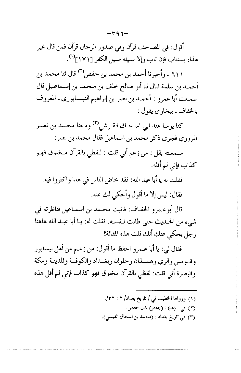611 - وَأَخْبَرَنَا أَحْمَدُ بْنُ مُحَمَّدِ بْنِ حَفْصٍ قَالَ: ثنا مُحَمَّدُ بْنُ أَحْمَدَ بْنِ سَلَمَةَ قَالَ: ثنا أَبُو صَالِحٍ خَلَفُ بْنُ مُحَمَّدِ بْنِ إِسْمَاعِيلَ قَالَ: سَمِعْتُ أَبَا عَمْرٍو أَحْمَدَ بْنِ نَصْرِ بْنِ إِبْرَاهِيمَ النَّيْسَابُورِيَّ الْمَعْرُوفَ بِالْخَفَّافِ بِبُخَارَى يَقُولُ: كُنَّا يَوْمًا عِنْدَ أَبِي إِسْحَاقَ الْقُرَشِيِّ وَمَعَنَا مُحَمَّدُ بْنُ نَصْرٍ الْمَرْوَزِيُّ , فَجَرَى ذِكْرُ مُحَمَّدِ بْنِ إِسْمَاعِيلَ , فَقَالَ مُحَمَّدُ بْنُ نَصْرٍ: سَمِعْتُهُ يَقُولُ: §مَنْ زَعَمَ أَنِّي قُلْتُ: لَفْظِي بِالْقُرْآنِ مَخْلُوقٌ , فَهُوَ كَذَّابٌ , فَإِنَّى لَمْ أَقُلْهُ. فَقُلْتُ لَهُ: يَا أَبَا عَبْدِ اللَّهِ فَقَدْ خَاضَ النَّاسُ فِي هَذَا وَأَكْثَرُوا فِيهِ. فَقَالَ: لَيْسَ إِلَّا مَا أَقُولُ وَأَحْكِي لَكَ عَنْهُ. قَالَ أَبُو عَمْرٍو الْخَفَّافُ: فَأَتَيْتُ مُحَمَّدَ بْنَ إِسْمَاعِيلَ فَنَاظَرْتُهُ فِي شَيْءٍ مِنَ الْحَدِيثِ حَتَّى طَابَتْ نَفْسُهُ فَقُلْتُ لَهُ: يَا أَبَا عَبْدِ اللَّهِ هَاهُنَا رَجُلٌ يَحْكِي عَنْكَ أَنَّكَ قُلْتَ هَذِهِ الْمَقَالَةِ. فَقَالَ لِي: يَا أَبَا عَمْرٍو احْفَظْ مَا أَقُولُ: مَنْ زَعَمَ مِنْ أَهْلِ نَيْسَابُورَ وَقُومَسَ وَالرَّيِّ وَهَمَذَانَ وَحُلْوَانَ وَبَغْدَادَ وَالْكُوفَةِ وَالْمَدِينَةِ وَمَكَّةَ وَالْبَصْرَةِ أَنِّي قُلْتُ: لَفْظِي بِالْقُرْآنِ مَخْلُوقٌ , فَهُوَ كَذَّابٌ , فَإِنَّى لَمْ أَقُلْ هَذِهِ -[397]- الْمَقَالَةَ , إِلَّا أَنِّي قُلْتُ: أَفْعَالُ الْعِبَادِ مَخْلُوقَةٌ