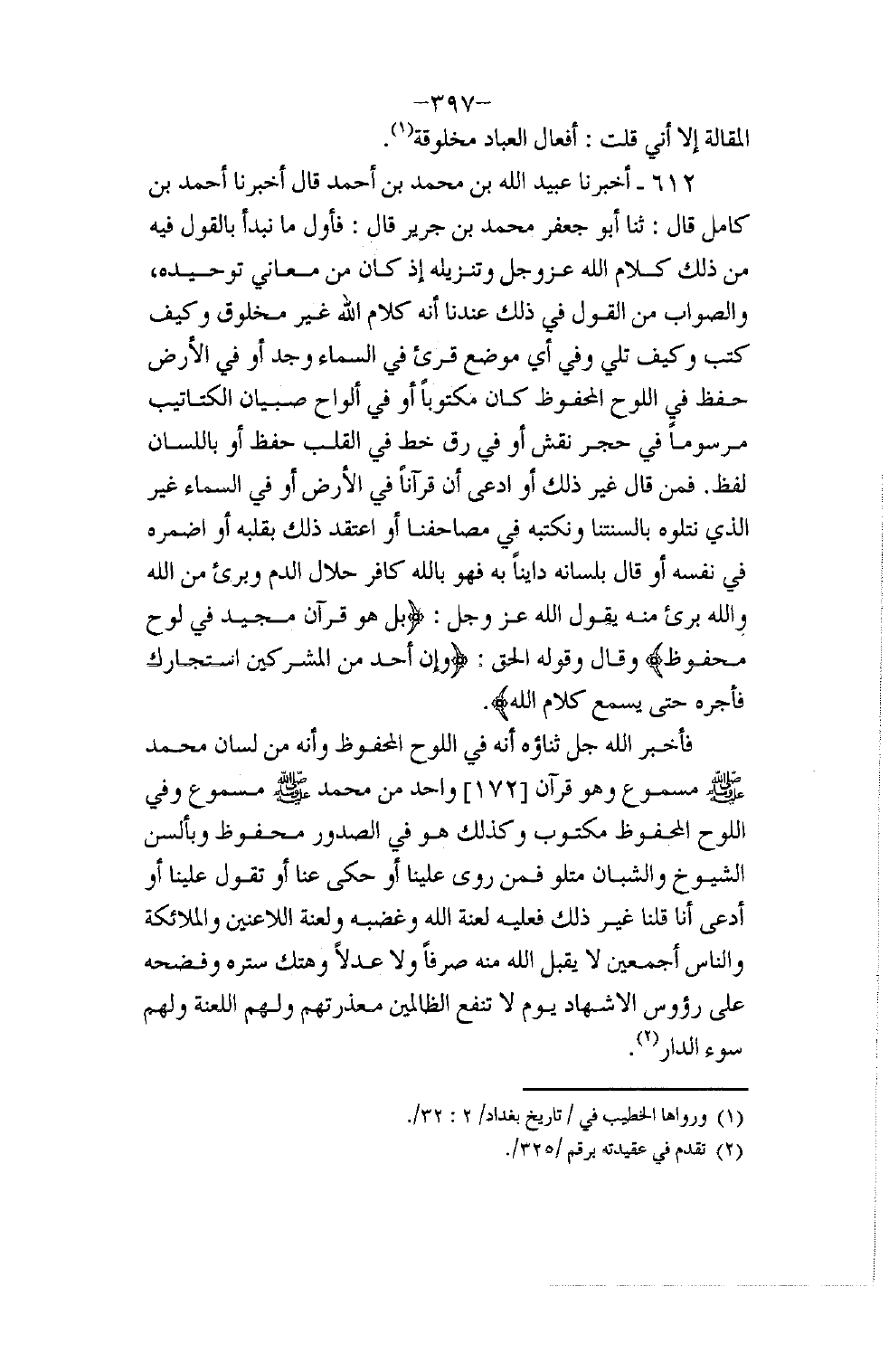 612 - أَخْبَرَنَا عُبَيْدُ اللَّهِ بْنُ مُحَمَّدِ بْنِ أَحْمَدَ قَالَ: أَخْبَرَنَا أَحْمَدُ بْنُ كَامِلٍ قَالَ: ثنا أَبُو جَعْفَرٍ مُحَمَّدُ بْنُ جَرِيرٍ قَالَ: فَأَوَّلُ مَا نَبْدَأُ بِالْقَوْلِ فِيهِ مِنْ ذَلِكَ كَلَامُ اللَّهِ عَزَّ وَجَلَّ وَتَنْزِيلُهُ؛ إِذْ كَانَ مِنْ مَعَانِي تَوْحِيدِهِ , وَالصَّوَابُ مِنَ الْقَوْلِ فِي ذَلِكَ عِنْدَنَا أَنَّهُ §كَلَامُ اللَّهِ غَيْرُ مَخْلُوقٍ , وَكَيْفَ كُتِبَ , وَكَيْفَ تُلِيَ , وَفِي أَيِّ مَوْضِعٍ قُرِئَ , فِي السَّمَاءِ وُجِدَ , أَوْ فِي الْأَرْضِ حُفِظَ , فِي اللَّوْحِ الْمَحْفُوظِ كَانَ مَكْتُوبًا , أَوْ فِي أَلْوَاحِ صِبْيَانِ الْكَتَاتِيبِ مَرْسُومًا , فِي حَجَرٍ نُقِشَ , أَوْ فِي رَقٍّ خُطَّ , فِي الْقَلْبِ حُفِظَ , أَوْ بِاللِّسَانِ لُفِظَ , فَمَنْ قَالَ غَيْرَ ذَلِكَ أَوِ ادَّعَى أَنَّ قُرْآنًا فِي الْأَرْضِ أَوْ فِي السَّمَاءِ غَيْرَ الَّذِي نَتْلُوهُ بِأَلْسِنَتِنَا وَلَكِنَّهُ فِي مَصَاحِفِنَا , أَوِ اعْتَقَدَ ذَلِكَ بِقَلْبِهِ , أَوْ أَضْمَرَهُ فِي نَفْسِهِ , أَوْ قَالَ بِلِسَانِهِ دَايِنًا بِهِ , فَهُوَ بِاللَّهِ كَافِرٌ , حَلَالُ الدَّمِ , وَبَرِيءٌ مِنَ اللَّهِ , وَاللَّهُ بَرِيءٌ مِنْهُ , يَقُولُ اللَّهُ عَزَّ وَجَلَّ: {بَلْ هُوَ قُرْآنٌ مَجِيدٌ فِي لَوْحٍ مَحْفُوظٍ} [البروج: 22] . وَقَالَ وَقَوْلُهُ الْحَقُّ: {وَإِنْ أَحَدٌ مِنَ الْمُشْرِكِينَ اسْتَجَارَكَ فَأَجِرْهُ حَتَّى يَسْمَعَ كَلَامَ اللَّهِ} [التوبة: 6] . فَأَخْبَرَ اللَّهُ جَلَّ ثَنَاؤُهُ أَنَّهُ فِي اللَّوْحِ الْمَحْفُوظِ , وَأَنَّهُ مِنْ لِسَانِ مُحَمَّدٍ صَلَّى اللهُ عَلَيْهِ وَسَلَّمَ مَسْمُوعٌ , وَهُوَ قُرْآنٌ وَاحِدٌ , مِنْ مُحَمَّدِ صَلَّى اللهُ عَلَيْهِ وَسَلَّمَ مَسْمُوعٌ , وَفِي اللَّوْحِ الْمَحْفُوظِ مَكْتُوبٌ , وَكَذَلِكَ هُوَ فِي الصُّدُورِ مَحْفُوظٌ , وَبِأَلْسُنِ الشُّيُوخِ وَالشُّبَّانِ مَتْلُوٌّ , فَمَنْ رَوَى عَلَيْنَا أَوْ حَكَى عَنَّا أَوْ تَقَوَّلَ عَلَيْنَا أَوِ ادَّعَى أَنَّا قُلْنَا غَيْرَ ذَلِكَ فَعَلَيْهِ لَعْنَةُ اللَّهِ وَغَضَبُهُ , وَلَعْنَةُ اللَّاعِنِينَ وَالْمَلَائِكَةِ وَالنَّاسِ أَجْمَعِينَ , لَا يَقْبَلُ اللَّهُ مِنْهُ صَرْفًا وَلَا عَدْلًا , وَهَتَكَ سِتْرَهُ , وَفَضَحَهُ عَلَى رُءُوسِ الْأَشْهَادِ , يَوْمَ لَا تَنْفَعُ الظَّالِمِينَ مَعْذِرَتُهُمْ وَلَهُمُ اللَّعْنَةُ وَلَهُمْ سُوءُ الدَّارِ