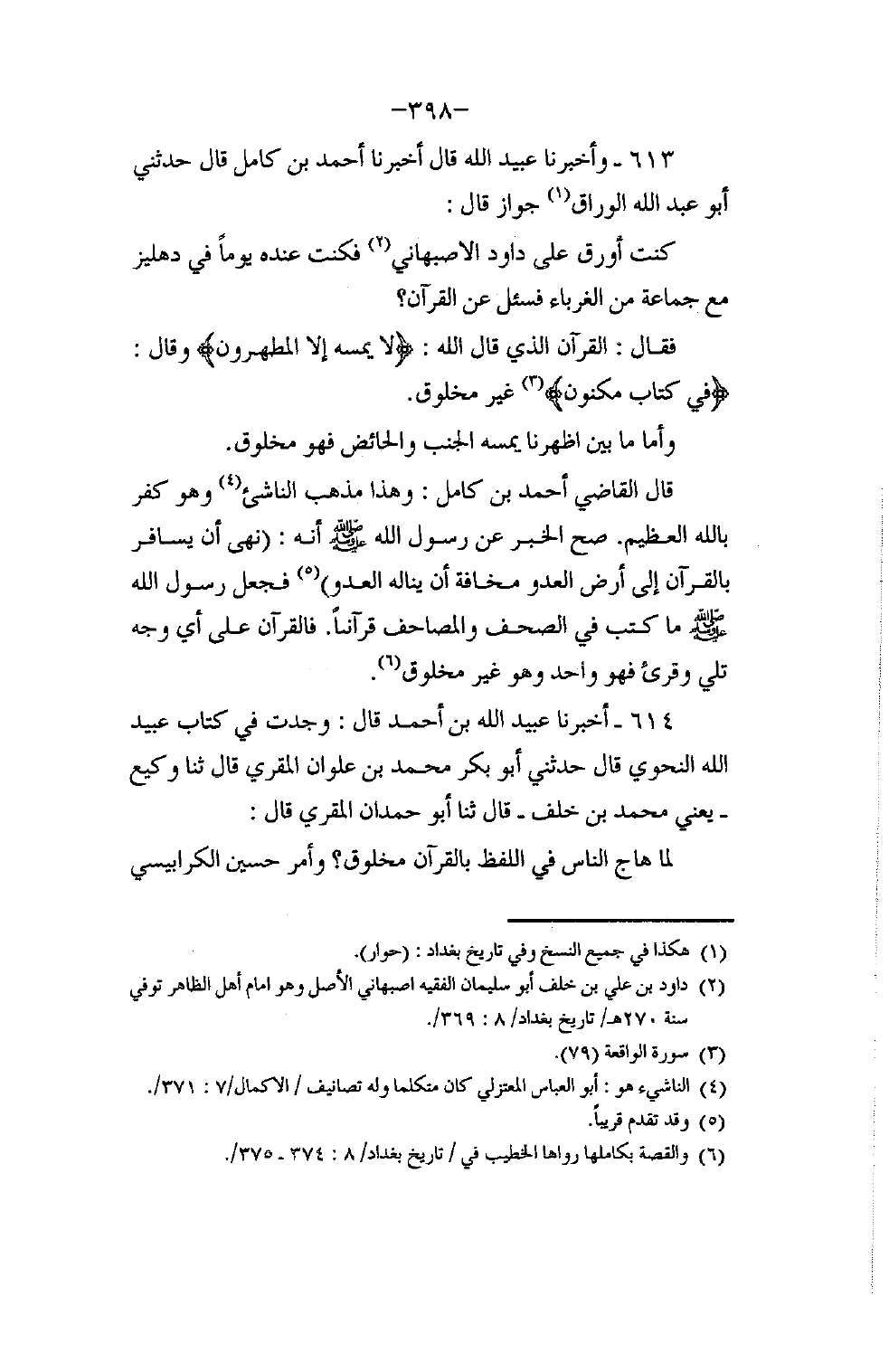 613 - وَأَخْبَرَنَا عُبَيْدُ اللَّهِ قَالَ: أَخْبَرَنَا أَحْمَدُ بْنُ كَامِلٍ قَالَ: حَدَّثَنِي أَبُو عَبْدِ اللَّهِ الْوَارِقُ جَوَّازًا قَالَ: كُنْتُ أُورِقُ عَلَى دَاوُدَ الْأَصْبَهَانِيِّ فَكُنْتُ عِنْدَهُ يَوْمًا فِي دِهْلِيزِهِ مَعَ جَمَاعَةٍ مِنَ الْغُرَبَاءِ , فَسُئِلَ عَنِ الْقُرْآنِ فَقَالَ: §الْقُرْآنُ الَّذِي قَالَهُ اللَّهُ: {لَا يَمَسُّهُ إِلَّا الْمُطَهَّرُونَ} [الواقعة: 79] وَقَالَ: {فِي كِتَابٍ مَكْنُونٍ} [الواقعة: 78] غَيْرُ مَخْلُوقٌ. وَأَمَّا مَا بَيْنَ أَظْهُرِنَا يَمَسُّهُ الْجُنُبُ وَالْحَائِضُ فَهُوَ مَخْلُوقٌ. قَالَ الْقَاضِي أَحْمَدُ بْنُ كَامِلٍ: وَهَذَا مَذْهَبُ النَّاشِئِ , وَهُوَ كُفْرٌ بِاللَّهِ الْعَظِيمِ , صَحَّ الْخَبَرُ عَنْ رَسُولِ اللَّهِ صَلَّى اللهُ عَلَيْهِ وَسَلَّمَ أَنَّهُ «نَهَى أَنْ يُسَافَرَ بِالْقُرْآنِ إِلَى أَرْضِ الْعَدُوِّ مَخَافَةَ أَنْ يَنَالَهُ الْعَدُوُّ» . فَجَعَلَ رَسُولُ اللَّهِ صَلَّى اللهُ عَلَيْهِ وَسَلَّمَ مَا كُتِبَ فِي الصُّحُفِ وَالْمَصَاحِفِ قُرْآنًا , فَالْقُرْآنُ عَلَى أَيِّ وَجْهٍ تُلِيَ وَقُرِئَ فَهُوَ وَاحِدٌ , وَهُوَ غَيْرُ مَخْلُوقٍ.