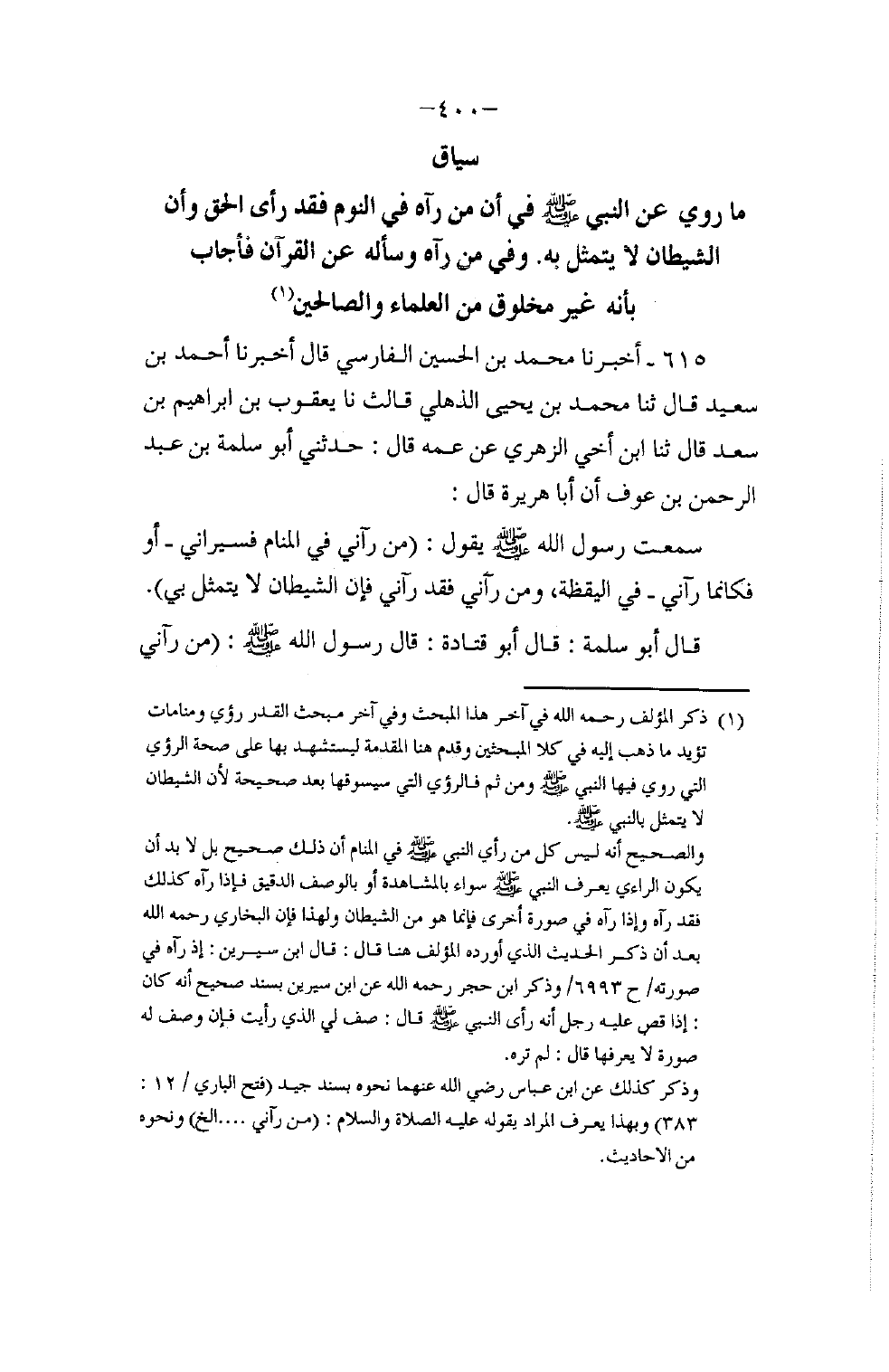 §سِيَاقُ مَا رُوِيَ عَنِ النَّبِيِّ صَلَّى اللهُ عَلَيْهِ وَسَلَّمَ فِي أَنَّ مَنْ رَآهُ فِي النَّوْمِ فَقَدْ رَأَى الْحَقَّ وَأَنَّ الشَّيْطَانَ لَا يَتَمَثَّلُ بِهِ. وَفِي مَنْ رَآهُ وَسَأَلَهُ عَنِ الْقُرْآنِ فَأَجَابَ بِأَنَّهُ غَيْرُ مَخْلُوقٍ مِنَ الْعُلَمَاءِ وَالصَّالِحِينَ