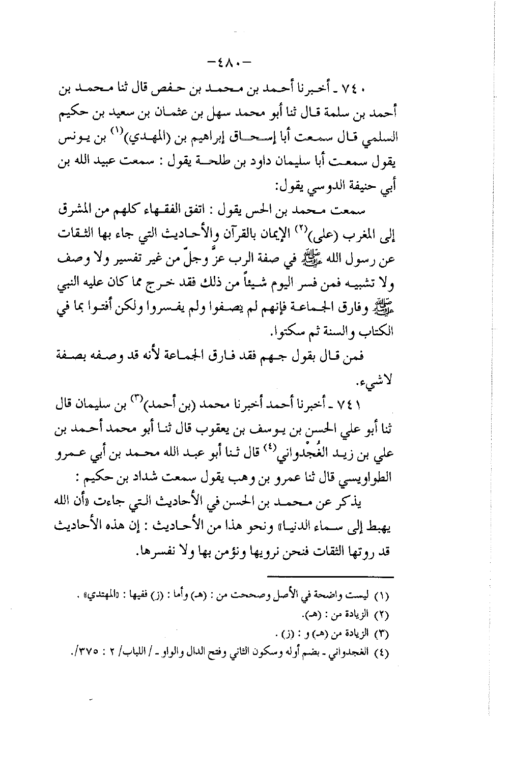741 - أَخْبَرَنَا أَحْمَدُ، أَخْبَرَنَا مُحَمَّدُ بْنُ أَحْمَدَ بْنِ سُلَيْمَانَ، قَالَ: ثَنَا أَبُو عَلِيٍّ الْحَسَنُ بْنُ يُوسُفَ بْنِ يَعْقُوبَ، قَالَ: ثَنَا أَبُو مُحَمَّدٍ أَحْمَدُ بْنُ عَلِيِّ بْنِ زَيْدٍ الْغُجْدَوَانِيُّ قَالَ: ثَنَا أَبُو عَبْدِ اللَّهِ مُحَمَّدُ بْنُ أَبِي عَمْرٍو الطَّوَاوِيسِيُّ قَالَ: ثَنَا عَمْرُو بْنُ وَهْبٍ، يَقُولُ: سَمِعْتُ شَدَّادَ بْنَ حَكِيمٍ يَذْكُرُ، عَنْ مُحَمَّدِ بْنِ الْحَسَنِ، فِي الْأَحَادِيثِ الَّتِي جَاءَتْ: §«إِنَّ اللَّهَ يَهْبِطُ إِلَى سَمَاءِ الدُّنْيَا» وَنَحْوَ هَذَا مِنَ الْأَحَادِيثِ: إِنَّ هَذِهِ الْأَحَادِيثَ قَدْ رَوَتْهَا الثِّقَاتُ، فَنَحْنُ نَرْوِيهَا وَنُؤْمِنُ بِهَا وَلَا نُفَسِّرُهَا
