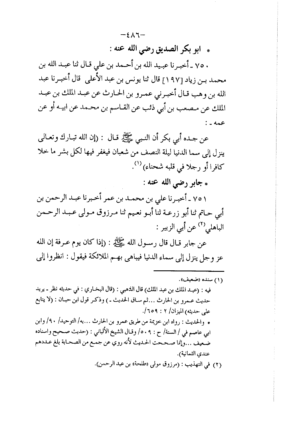 750 - أَخْبَرَنَا عُبَيْدُ اللَّهِ بْنُ أَحْمَدَ بْنِ عَلِيٍّ، قَالَ: ثَنَا عَبْدُ اللَّهِ بْنُ مُحَمَّدِ بْنِ زِيَادٍ، قَالَ: ثَنَا يُونُسُ بْنُ عَبْدِ الْأَعْلَى، قَالَ: أَخْبَرَنَا عَبْدُ اللَّهِ بْنُ وَهْبٍ، قَالَ: أَخْبَرَنِي عَمْرُو بْنُ الْحَارِثِ، عَنْ عَبْدِ الْمَلِكِ بْنِ عَبْدِ الْمَلِكِ، عَنْ مُصْعَبِ بْنِ أَبِي ذِئْبٍ، عَنِ الْقَاسِمِ بْنِ مُحَمَّدٍ، عَنْ أَبِيهِ، أَوْ عَنْ عَمِّهِ، عَنْ جَدِّهِ أَبِي بَكْرٍ، أَنَّ النَّبِيَّ صَلَّى اللهُ عَلَيْهِ وَسَلَّمَ قَالَ: «إِنَّ §اللَّهَ تَبَارَكَ وَتَعَالَى يَنْزِلُ إِلَى سَمَا الدُّنْيَا لَيْلَةَ النِّصْفِ مِنْ شَعْبَانَ فَيَغْفِرُ فِيهَا لِكُلِّ بَشَرٍ مَا خَلَا كَافِرًا أَوْ رَجُلًا فِي قَلْبِهِ شَحْنَاءُ»