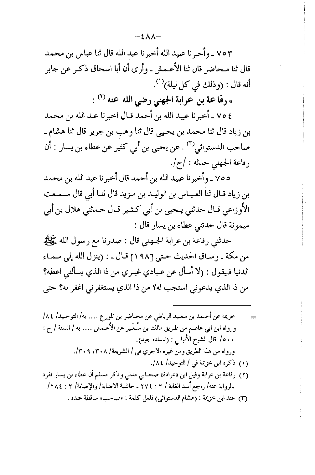 754 - أَخْبَرَنَا عُبَيْدُ اللَّهِ بْنُ أَحْمَدَ، قَالَ: أَخْبَرَنَا عَبْدُ اللَّهِ بْنُ مُحَمَّدِ بْنِ زِيَادٍ، قَالَ: ثَنَا مُحَمَّدُ بْنُ يَحْيَى، قَالَ: ثَنَا وَهْبُ بْنُ جَرِيرٍ، قَالَ: ثَنَا هِشَامٌ، صَاحِبُ الدَّسْتُوَائِيِّ , عَنْ يَحْيَى بْنِ أَبِي كَثِيرٍ، عَنْ عَطَاءِ بْنِ يَسَارٍ، أَنَّ رِفَاعَةَ الْجُهَنِيَّ، حَدَّثَهُ ح