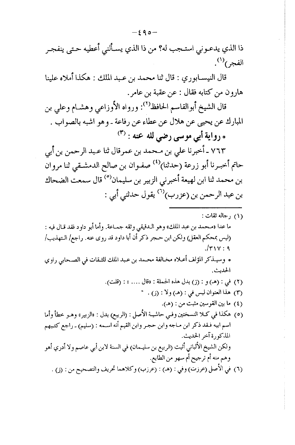 763 - أَخْبَرَنَا عَلِيُّ بْنُ مُحَمَّدِ بْنِ عُمَرَ، قَالَ: ثَنَا عَبْدُ الرَّحْمَنِ بْنُ أَبِي حَاتِمٍ، أَخْبَرَنَا أَبُو زُرْعَةَ، حَدَّثَنَا صَفْوَانُ بْنُ صَالِحٍ الدِّمَشْقِيُّ، ثَنَا مَرْوَانُ بْنُ مُحَمَّدٍ، ثَنَا ابْنُ لَهِيعَةَ، أَخْبَرَنِي الزُّبَيْرُ بْنُ سُلَيْمَانَ، قَالَ: سَمِعْتُ الضَّحَّاكَ بْنَ عَبْدِ الرَّحْمَنِ بْنِ عزربٍ، يَقُولُ حَدَّثَنِي أَبِي -[496]-، عَنْ أَبِي مُوسَى الْأَشْعَرِيِّ، قَالَ: قَالَ رَسُولُ اللَّهِ صَلَّى اللهُ عَلَيْهِ وَسَلَّمَ: §«إِنَّ اللَّهَ يَنْزِلُ لَيْلَةَ النِّصْفِ مِنْ شَعْبَانَ فَيَغْفِرُ لِخَلْقِهِ كُلِّهِمْ أَجْمَعِينَ إِلَّا لِمُشْرِكٍ أَوْ مُشَاحِنٍ»