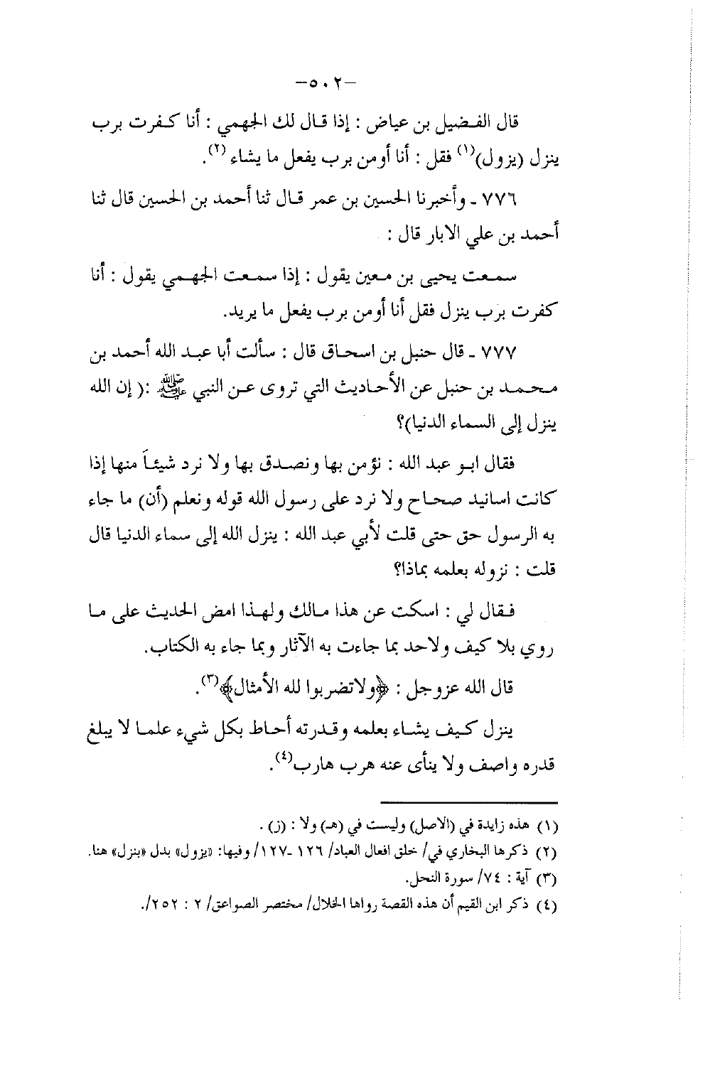 777 - قَالَ حَنْبَلُ بْنُ إِسْحَاقَ قَالَ: سَأَلْتُ أَبَا عَبْدِ اللَّهِ أَحْمَدَ بْنَ حَنْبَلٍ عَنِ الْأَحَادِيثِ الَّتِي تُرْوَى عَنِ النَّبِيِّ صَلَّى اللهُ عَلَيْهِ وَسَلَّمَ: «إِنَّ اللَّهَ يَنْزِلُ إِلَى السَّمَاءِ الدُّنْيَا» ، فَقَالَ أَبُو عَبْدِ اللَّهِ: §" نُؤْمِنُ بِهَا وَنُصَدِّقُ بِهَا وَلَا نَرُدُّ شَيْئًا مِنْهَا إِذَا كَانَتْ أَسَانِيدُ صِحَاحَ , وَلَا نَرُدُّ عَلَى رَسُولِ اللَّهِ قَوْلَهُ وَنَعْلَمُ أَنَّ مَا جَاءَ بِهِ الرَّسُولُ حَقٌّ , حَتَّى قُلْتُ لِأَبِي عَبْدِ اللَّهِ: " يَنْزِلُ اللَّهُ إِلَى سَمَاءِ الدُّنْيَا قَالَ: قُلْتُ: نُزُولُهُ بِعِلْمِهِ بِمَاذَا؟ فَقَالَ لِيَ: اسْكُتْ عَنْ هَذَا , مَالَكَ وَلِهَذَا , أَمْضِ الْحَدِيثَ عَلَى مَا رُوِيَ بِلَا كَيْفٍ وَلَا حَدٍّ , إِنَّمَا جَاءَتْ بِهِ الْأَثَارُ وَبِمَا جَاءَ بِهِ الْكِتَابُ قَالَ اللَّهُ عَزَّ وَجَلَّ: {فَلَا تَضْرِبُوا لِلَّهِ الْأَمْثَالَ} [النحل: 74] يَنْزِلُ كَيْفَ يَشَاءُ بِعِلْمِهِ وَقُدْرَتِهِ وَعَظَمَتِهِ , أَحَاطَ بِكَلِّ شَيْءٍ عِلْمًا , لَا يَبْلُغُ قَدْرَهُ وَاصِفٌ وَلَا يَنْأَى عَنْهُ هَرَبَ هَارِبٌ "