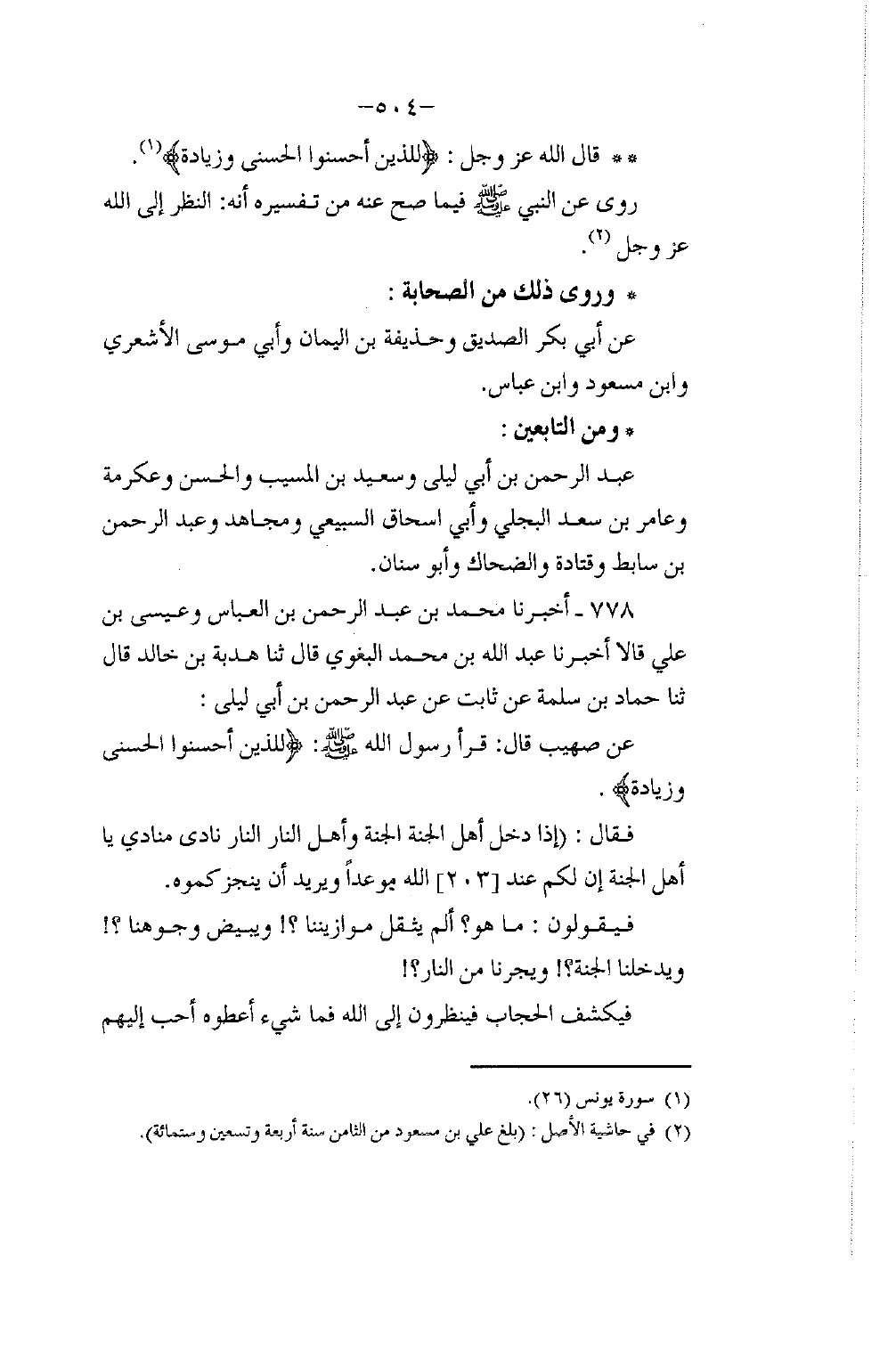 778 - أَخْبَرَنَا مُحَمَّدُ بْنُ عَبْدِ الرَّحْمَنِ بْنِ الْعَبَّاسِ، وَعِيسَى بْنُ عَلِيٍّ، قَالَا: أَخْبَرَنَا عَبْدُ اللَّهِ بْنُ مُحَمَّدٍ الْبَغَوِيُّ، قَالَ: ثَنَا هُدْبَةُ بْنُ خَالِدٍ، قَالَ: ثَنَا حَمَّادُ بْنُ سَلَمَةَ عَنْ ثَابِتٍ، عَنْ عَبْدِ الرَّحْمَنِ بْنِ أَبِي لَيْلَى، عَنْ صُهَيْبٍ، قَالَ: قَرَأَ رَسُولُ اللَّهِ صَلَّى اللهُ عَلَيْهِ وَسَلَّمَ {لِلَّذِينَ أَحْسَنُوا الْحُسْنَى وَزِيَادَةٌ} [يونس: 26] فَقَالَ: " إِذَا دَخَلَ أَهْلُ الْجَنَّةِ الْجَنَّةَ وَأَهْلُ النَّارِ النَّارَ نَادَى مُنَادٍ: يَا أَهْلَ الْجَنَّةِ إِنَّ لَكَمْ عِنْدَ اللَّهِ مَوْعِدًا وَيُرِيدُ أَنْ يُنْجِزَكُمُوهُ فَيَقُولُونَ: مَا هُوَ أَلَمْ يُثَقِّلْ مَوَازِينَنَا وَيُبَيِّضْ وُجُوهَنَا وَيُدْخِلْنَا الْجَنَّةَ وَيُجِرْنَا مِنَ النَّارِ؟ فَيُكْشَفُ الْحِجَابُ؛ §فَيَنْظُرُونَ إِلَى اللَّهِ فَمَا شَيْءٌ أُعْطُوهُ أَحَبَّ إِلَيْهِمْ -[505]- مِنَ النَّظَرِ إِلَيْهِ , وَهُوَ الزِّيَادَةُ " أَخْرَجَهُ مُسْلِمٌ فِي الصَّحِيحِ