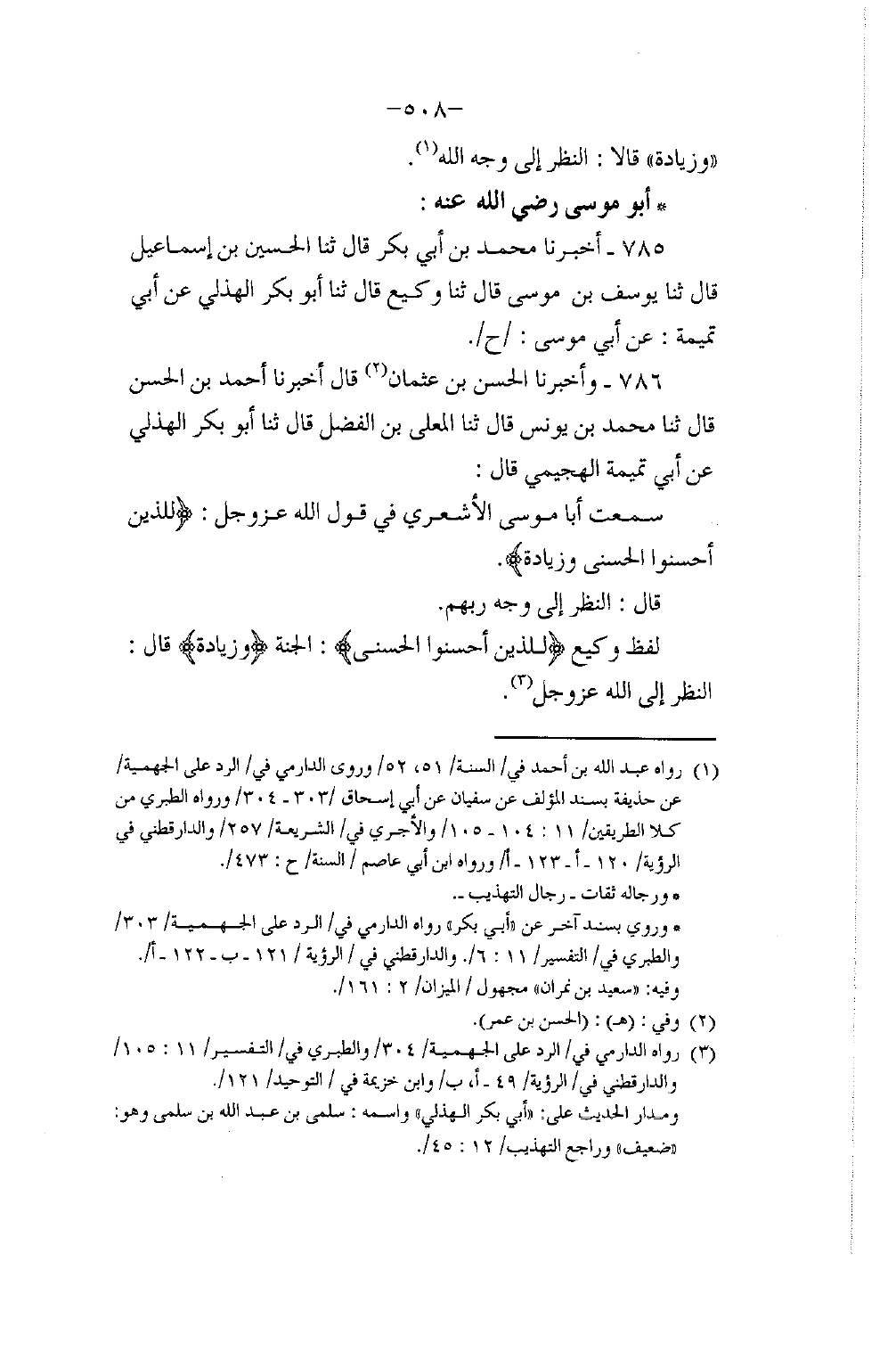 786 - وَأَخْبَرَنَا الْحَسَنُ بْنُ عُثْمَانَ، قَالَ: أَخْبَرَنَا أَحْمَدُ بْنُ الْحَسَنِ، قَالَ: ثَنَا مُحَمَّدُ بْنُ يُونُسَ، قَالَ: ثَنَا الْمُعَلَّى بْنُ الْفَضْلِ، قَالَ: ثَنَا أَبُو بَكْرٍ الْهُذَلِيُّ، عَنْ أَبِي تَمِيمَةَ الْهُجَيْمِيِّ، قَالَ: سَمِعْتُ أَبَا مُوسَى الْأَشْعَرِيَّ، يَقُولُ فِي قَوْلِ اللَّهِ عَزَّ وَجَلَّ: {لِلَّذِينَ أَحْسَنُوا الْحُسْنَى وَزِيَادَةٌ} [يونس: 26] قَالَ: «§النَّظَرُ إِلَى وَجْهِ رَبِّهِمْ» لَفْظُ وَكِيعٍ {لِلَّذِينَ أَحْسَنُوا الْحُسْنَى} [يونس: 26] الْجَنَّةُ {وَزِيَادَةٌ} [يونس: 26] قَالَ: النَّظَرُ إِلَى اللَّهِ عَزَّ وَجَلَّ