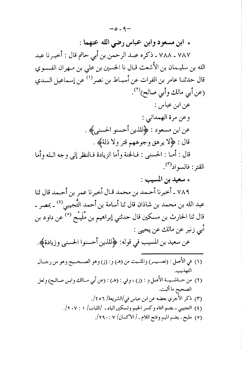 787 - ذَكَرَهُ عَبْدُ الرَّحْمَنِ بْنُ أَبِي حَاتِمٍ قَالَ: أَخْبَرَنَا عَبْدُ اللَّهِ بْنُ سُلَيْمَانَ بْنِ الْأَشْعَثِ، قَالَ: نَا الْحُسَيْنُ بْنُ عَلِيِّ بْنِ مِهْرَانَ الفَسَوِيُّ، قَالَ: حَدَّثَنَا عَامِرُ بْنُ الْفُرَاتِ، عَنْ أَسْبَاطِ بْنِ نَصْرٍ، عَنْ إِسْمَاعِيلَ السُّدِّيِّ، عَنْ أَبِي مَالِكٍ، وَأَبِي صَالِحٍ , عَنِ ابْنِ عَبَّاسٍ، وَعَنْ مُرَّةَ الْهَمْدَانِيِّ، عَنِ ابْنِ مَسْعُودٍ، {لِلَّذِينَ أَحْسَنُوا الْحُسْنَى} [يونس: 26] قَالَ: {لَا يَرْهَقُ وُجُوهَهُمْ قَتَرٌ وَلَا ذِلَّةٌ} [يونس: 26] قَالَ: " أَمَّا الْحُسْنَى: فَالْجَنَّةُ وَأَمَّا §الزِّيَادَةُ: فَالنَّظَرُ إِلَى وَجْهِ اللَّهِ وَأَمَّا الْقَتَرُ: فَالسَّوَادُ "
