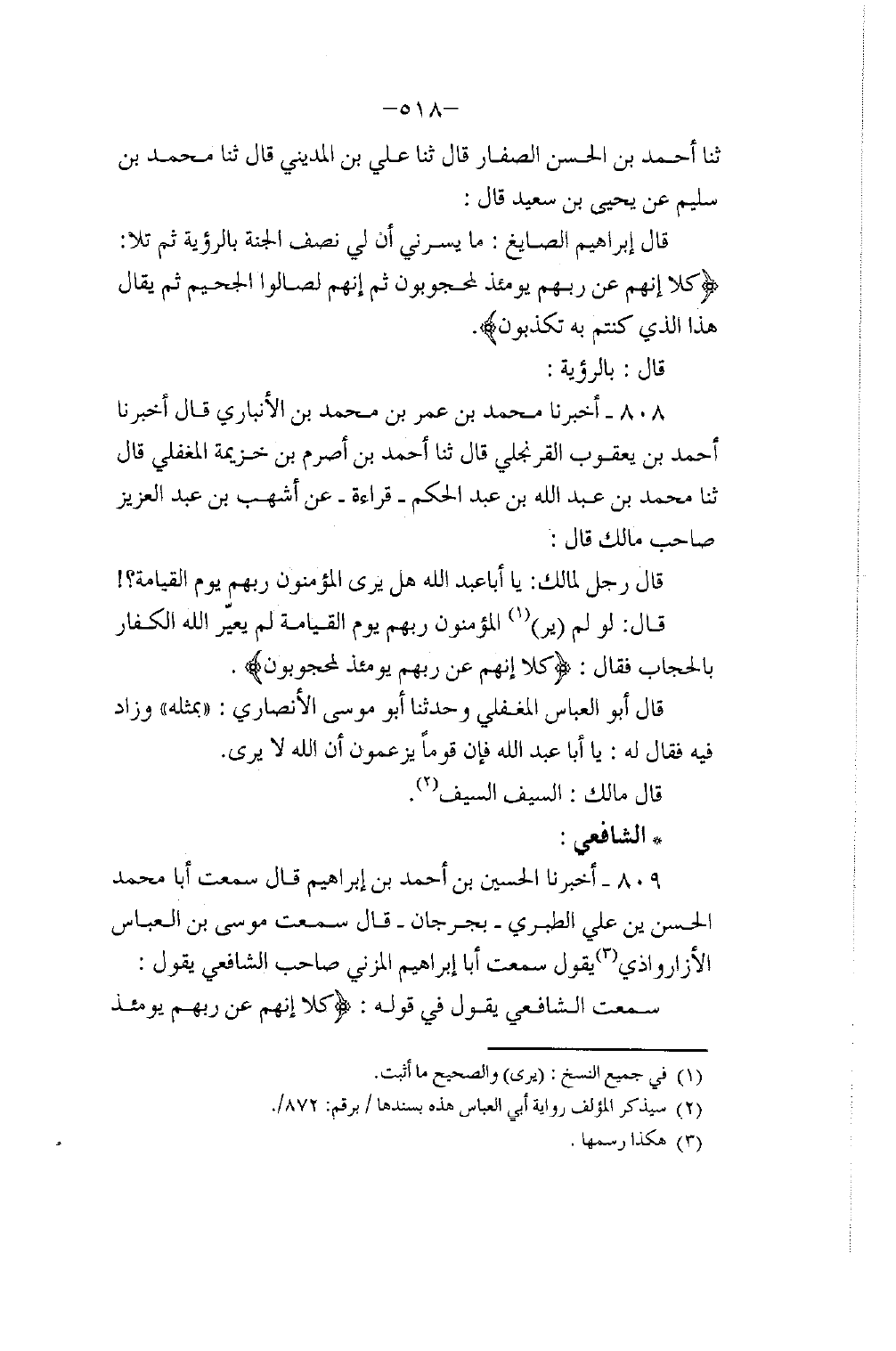 808 - أَخْبَرَنَا مُحَمَّدُ بْنُ عُمَرَ بْنِ مُحَمَّدٍ الْأَنْبَارِيُّ، قَالَ: أَخْبَرَنَا أَحْمَدُ بْنُ يَعْقُوبِ الْقَرَنْجُلِيُّ، قَالَ: ثَنَا أَحْمَدُ بْنُ أَصْرَمَ بْنِ خُزَيْمَةَ الْمَعْقِلِيُّ، قَالَ: ثَنَا مُحَمَّدُ بْنُ عَبْدِ اللَّهِ بْنِ عَبْدِ الْحَكَمِ، قِرَاءَةً عَنْ أَشْهَبَ بْنِ عَبْدِ الْعَزِيزِ، صَاحِبِ مَالِكٍ قَالَ: قَالَ رَجُلٌ لِمَالِكٍ: يَا أَبَا عَبْدِ اللَّهِ هَلْ يَرَى الْمُؤْمِنُونَ رَبَّهُمْ يَوْمَ الْقِيَامَةِ؟ قَالَ: §" لَوْ لَمْ يَرَ الْمُؤْمِنُونَ رَبَّهُمْ يَوْمَ الْقِيَامَةِ لَمْ يُعَيِّرِ اللَّهُ الْكُفَّارَ بِالْحِجَابِ , فَقَالَ: {كَلَّا إِنَّهُمْ عَنْ رَبِّهِمْ يَوْمَئِذٍ لَمَحْجُوبُونَ} [المطففين: 15] " قَالَ أَبُو الْعَبَّاسِ الْمَعْقِلِيُّ , وَحَدَّثَنَا أَبُو مُوسَى الْأَنْصَارِيُّ بِمِثْلِهِ وَزَادَ فِيهِ , فَقَالَ لَهُ: يَا أَبَا عَبْدِ اللَّهِ فَإِنَّ قَوْمًا يَزْعُمُونَ أَنَّ اللَّهَ لَا يُرَى قَالَ مَالِكٌ: السَّيْفَ السَّيْفَ