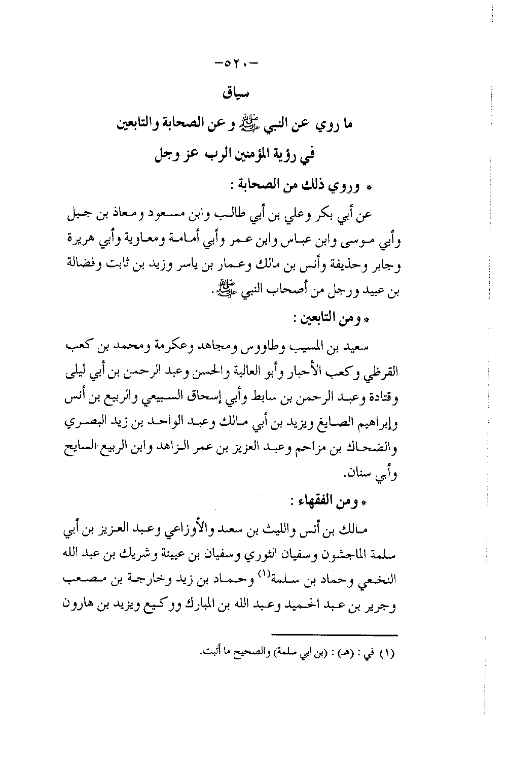 §سِيَاقُ مَا رُوِيَ عَنِ النَّبِيِّ صَلَّى اللهُ عَلَيْهِ وَسَلَّمَ، وَعَنِ الصَّحَابَةِ وَالتَّابِعِينَ فِي رُؤْيَةِ الْمُؤْمِنِينَ الرَّبَّ عَزَّ وَجَلَّ وَرَوَى ذَلِكَ مِنَ الصَّحَابَةِ: عَنْ أَبِي بَكْرٍ، وَعَلِيِّ بْنِ أَبِي طَالِبٍ، وَابْنِ مَسْعُودٍ، وَمُعَاذِ بْنِ جَبَلٍ، وَأَبِي مُوسَى، وَابْنِ عَبَّاسٍ، وَابْنِ عُمَرَ، وَأَبِي أُمَامَةَ، وَمُعَاوِيَةَ، وَأَبِي هُرَيْرَةَ، وَجَابِرٍ، وَحُذَيْفَةَ، وَأَنَسِ بْنِ مَالِكٍ، وَعَمَّارِ بْنِ يَاسِرٍ، وَزَيْدِ بْنِ ثَابِتٍ، وَفَضَالَةَ بْنِ عُبَيْدٍ، وَرَجُلٍ مِنْ أَصْحَابِ النَّبِيِّ صَلَّى اللهُ عَلَيْهِ وَسَلَّمَ. وَمِنَ التَّابِعِينَ: سَعِيدُ بْنُ الْمُسَيِّبِ، وَطَاوُسٌ، وَمُجَاهِدٌ، وَعِكْرِمَةُ، وَمُحَمَّدُ بْنُ كَعْبٍ الْقُرَظِيُّ، وَكَعْبُ الْأَحْبَارِ، وَأَبُو الْعَالِيَةِ، وَالْحَسَنُ، وَعَبْدُ الرَّحْمَنِ بْنُ أَبِي لَيْلَى، وَقَتَادَةُ وَعَبْدُ الرَّحْمَنِ بْنُ سَابِطٍ، وَأَبُو إِسْحَاقَ السَّبِيعِيُّ، وَالرَّبِيعُ بْنُ أَنَسٍ، وَإِبْرَاهِيمُ الصَّايِغِ، وَيَزِيدُ بْنُ أَبِي مَالِكٍ، وَعَبْدُ الْوَاحِدِ بْنُ يَزِيدَ النَّصْرِيُّ، وَالضَّحَّاكُ بْنُ مُزَاحِمٍ، وَعَبْدُ الْعَزِيزِ بْنُ عُمَرَ الزَّاهِدُ، وَابْنُ الرَّبِيعِ السَّايِحُ، وَأَبُو سِنَانٍ وَمِنَ الْفُقَهَاءِ: مَالِكُ بْنُ أَنَسٍ، وَاللَّيْثُ بْنُ سَعْدٍ، وَالْأَوْزَاعِيُّ، وَعَبْدُ الْعَزِيزِ بْنُ أَبِي سَلَمَةَ الْمَاجِشُونُ، وَسُفْيَانُ الثَّوْرِيُّ، وَسُفْيَانُ بْنُ عُيَيْنَةَ، وَشَرِيكُ بْنُ عَبْدِ اللَّهِ النَّخَعِيُّ، وَحَمَّادُ بْنُ سَلَمَةَ، وَحَمَّادُ بْنُ زَيْدٍ، وَخَارِجَةُ بْنُ مُصْعَبٍ وَجَرِيرُ بْنُ عَبْدِ الْحَمِيدِ، وَعَبْدُ اللَّهِ بْنُ الْمُبَارَكِ، وَوَكِيعٌ، وَيَزِيدُ بْنُ هَارُونَ